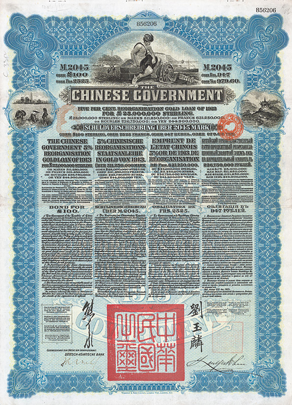Kuhlmann 705, Auflage: 4.800. Die erste Sterling-Anleihe der Republik China unter dem Revolutionär Dr. Sun Yat-sen (1911-1928), Mitinitiator war Präsident Yuan Shi-kai. Geplant war ein Volumen von 10 Mio. £, tatsächlich ausgegeben waren mit dem British & International Investment Trust als Konsortialführer 5 Mio. £ “zur Bezahlung schwebender Schulden und für öffentliche Arbeiten”. Abgesichert durch Verpfändung der Überschüsse aus der Salzsteuer. Auch unter der 1928 durch Tschiang Kai-schek errichteten Militärdiktatur wurde die Anleihe noch bis 1939 bedient. Die Kommunisten unter Mao lehnen dagegen bis heute die Bezahlung der Schulden ihrer Vorgänger-Regierungen ab. Mehrfarbiger Druck mit großem chinesischen Siegel, außerdem mit einem ungewöhnlichen Sicherheitsmerkmal: Als Stahlstich ausgeführter Extra-Aufkleber mit Nennwert-Angabe.
