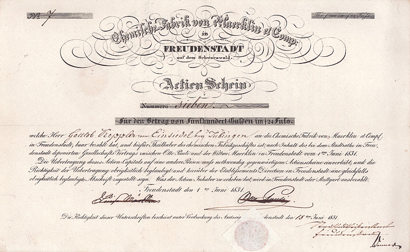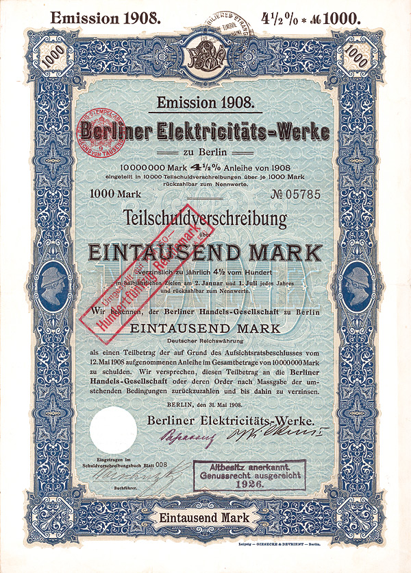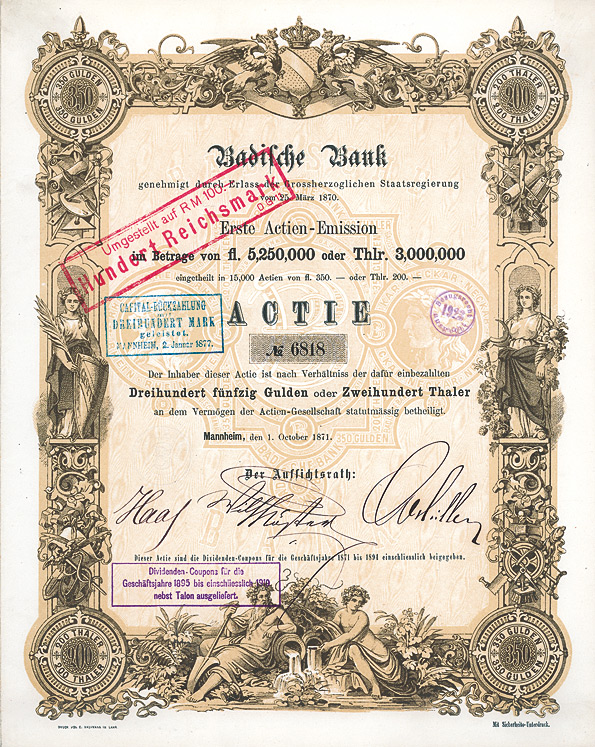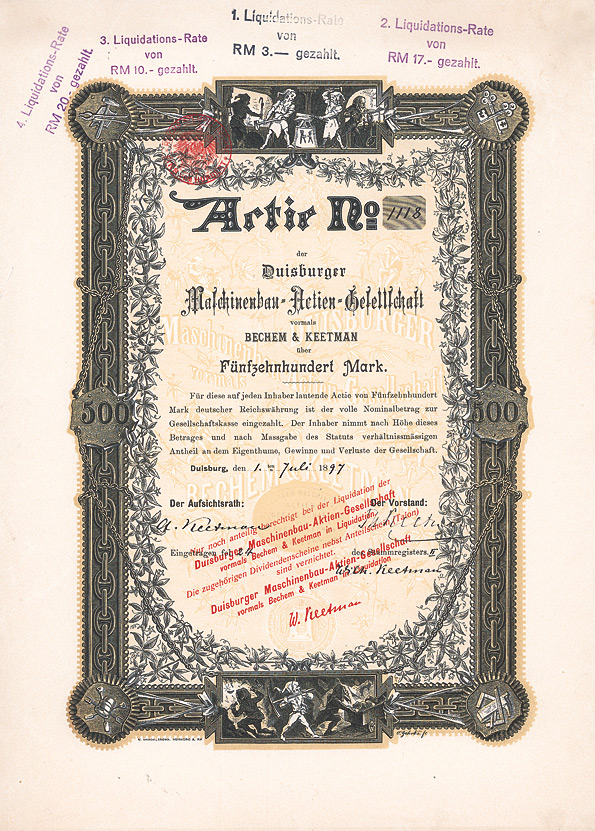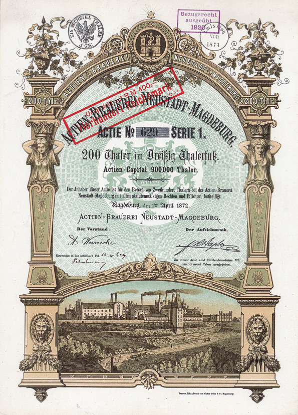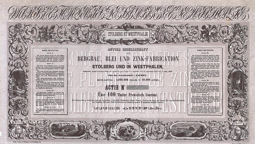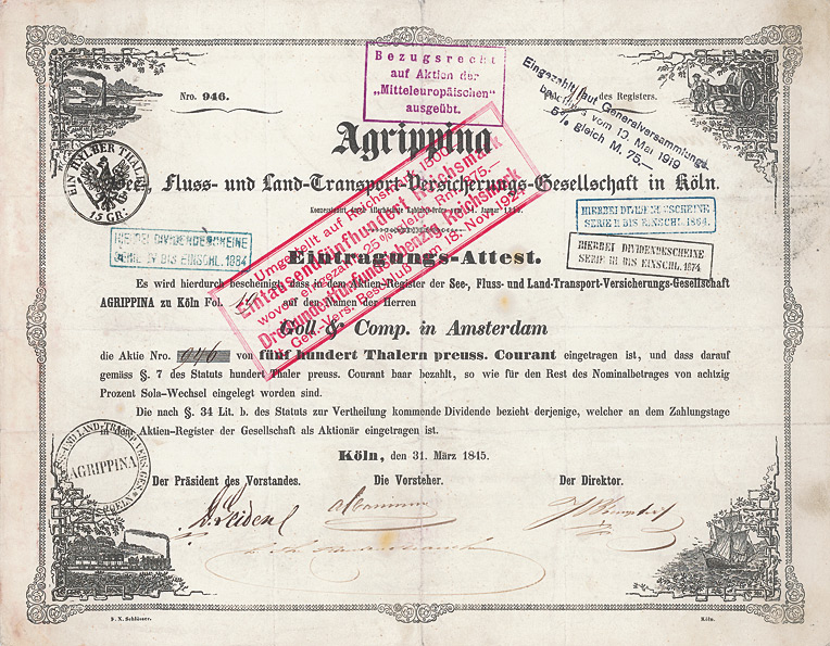 | Nr. 104 Schätzpreis: 60,00 EUR Startpreis: 30,00 EUR A.H.I-Bau Allgemeine Hoch- und Ingenieurbau-AG Aktie 50 DM, Nr. 16069 Köln, November 1970 Erhaltung: UNC/EF Auflage: 8.000, entstanden durch Umwandlung der 100-DM-Aktien. Gründung 1904 als “Allgemeine Hochbau-GmbH”, seit 1921 AG. 1933 Umbenennung in Allgemeine Hoch- und Tiefbau AG, 1935 in Allgemeine Hoch- und Ingenieurbau-AG, ab 1953 A.H.I.-BAU Allgemeine Hoch- und Ingenieurbau-AG. Am Ausbau der Häfen von Montevideo (Uruguay) und Rotterdam hatte die AHI schon vor Beginn des 1. Weltkrieges großen Anteil. 1969 Abschluss eines Beherrschungsvertrages mit der Strabag Bau-AG, die inzwischen über 90 % der Aktien besaß. Nr. 105 Schätzpreis: 50,00 EUR Startpreis: 25,00 EUR A. Moksel AG Aktie 5 DM, Nr. 19557 Buchloe, August 1995 Erhaltung: UNC/EF Gründung 1948 durch Alexander Moksel. Heute mit über 2.300 Mitarbeitern einer der größten Fleischverarbeiter (Schlachtung, Zerlegung und Handel) in Deutschland. 1987 Umwandlung in eine AG und an die Börse gegangen, 1992 durch die Gebr. März AG aus Rosenheim übernommen, nach deren Zusammenbruch zur niederländischen Bestmeat (heute: Vion Food Group) gekommen, dem zweitgrößten Fleischkonzern in Europa. Mit kpl. Kuponbogen. Nr. 106 Schätzpreis: 90,00 EUR Startpreis: 45,00 EUR A. Ostermaier AG Aktie 1.000 Mark, Nr. 17103 München, Mai 1923 VF Auflage: 3.000. Gründung im Okt. 1922. Fortführung des früher als oHG A. Ostermaier, Kolonialwaren,- Wein-, Drogen- und Chemikaliengrosshandlung betriebenen Geschäfts. Ein- und Verkauf sowie Herstellung von Nahrungs- und Genussmitteln, Drogen, Chemikalien, pharmazeutischen Präparaten. Ab 1925 wieder oHG. Mit kpl. anh. Kuponbogen. Weniger als 5 Stücke bisher aufgetaucht. Nr. 107 Schätzpreis: 70,00 EUR Startpreis: 35,00 EUR A. Riebeck’sche Montanwerke AG Aktie 1.000 RM, Nr. 1592 Frankfurt am Main, Februar 1967 Erhaltung: EF+ Auflage: 73.620. Das von Kommerzienrat Riebeck begründete Unternehmen wurde 1883 im Zuge der Auseinandersetzung unter seinen Erben eine AG, 1888 übernahm ein Bankenkonsortium alle Aktien. Grundlage des Unternehmens waren Dutzende von Braunkohlengruben im Oberröblinger, Zeitz-Weissenfelser und im Halle’schen Bezirk. Ein weiterer wichtiger Geschäftszweig war die Verarbeitung des in Schwelereien gewonnenen Teers auf Mineralöle und Paraffin. 1931 übernahmen die Rheinischen Stahlwerke ein großes Paket Riebeck-Aktien von der I. G. Farben und waren dann mit 87 % Mehrheitsaktionär. 1945 zu Gunsten des Landes Sachsen-Anhalt enteignet. Nach dem Krieg lagen neben geringfügigem Streubesitz die Riebeck-Aktien wieder bei I. G. Farben (rd. 50 %) und Rheinstahl (rd. 40 %). 1966 Sitzverlegung von Halle (Saale) nach Frankfurt (Main), Immer noch gültiges Stück, kaum erhältlich. Nr. 108 Schätzpreis: 300,00 EUR Startpreis: 150,00 EUR Aachen-Leipziger Versicherungs-AG Namens-Aktie 800 RM, Nr. 4053 Aachen, 25.5.1929 Erhaltung: EF+ Auflage: 1.000. Gründung 1876 für Versicherungs- und Rückversicherungs-Geschäfte auf den Gebieten der Sachschaden-Versicherung. 1980 Fusion mit der (1812 gegründeten) Berlinische Feuer-Versicherung zur “Vereinigte Aachen-Berlinische Versicherung AG” mit Sitz in München, 1987 Umfirmierung in “Vereinte Versicherung AG”, später noch Aufnahme der Magdeburger Versicherung AG (1994) und der Magdeburger Hagelversicherung AG (1999) durch Verschmelzung. Großaktionär war bis 1996 die Schweizer Rück, die ihre Beteiligung dann an die Allianz-Versicherung verkaufte. Großformatig, breite Umrahmung im Historismus-Stil. Nur ca. 10 Stücke sind seit vielen Jahren bekannt, das hier angebotene ist zudem sehr gut erhalten! Nr. 109 Schätzpreis: 180,00 EUR Startpreis: 90,00 EUR Aachener Kleinbahn-Gesellschaft Aktie 2.000 Mark, Nr. 6930 Aachen, 1.10.1912 Erhaltung: EF Auflage: 500. Gründung 1880 als Aachener und Burtscheider Pferdeeisenbahn, Dampfbetrieb ab 1884, elektrischer Betrieb ab 1895. Zeitweise über 200 km Betriebslänge. 1894 Umfirmierung in Aachener Kleinbahn, seit 1942 (die bis heute börsennotierte) Aachener Straßenbahn- und Energieversorgungs-AG. Großaktionäre sind seit langer Zeit Stadt und Landkreis Aachen. Lochentwertet. Nr. 110 Schätzpreis: 120,00 EUR Startpreis: 60,00 EUR Aachener und Münchener Beteiligungs-AG Sammel-Namensaktie 10 x 50 DM, Blankette Aachen, März 1987 Erhaltung: UNC/EF Gründung 1825 als Aachener Feuer-Versicherungs-Gesellschaft. Als die Gesellschaft 1834 ihren Geschäftsbetrieb auf Bayern ausdehnte, regte König Ludwig I. persönlich die Umfirmierung in „Aachener und Münchener Feuer-Versicherung“ an. Erst 136 Jahre später (1970) erneute Umfirmierung in Aachener und Münchener Versicherung AG und 1979 anläßlich der Neuordnung der Aachener und Münchener Gruppe in Aachener und Münchener Beteiligungs-AG. Nunmehr Holding für die ganze Gruppe, der Versicherungsbestand wurde auf die Cosmos Allgemeine Versicherungs-AG übertragen, die gleich im Anschluß neu als Aachener und Münchener Versicherung AG firmierte. 1998 erlangte im Zuge eines Ringtausches mit der Allianz und der französischen AGF die italienische Generali-Versicherung die Aktienmehrheit. 2001 in AMB Generali Holding AG umfirmiert. Mit restlichem Kuponbogen. Lochentwertet. Einzelstück aus einem Archiv. Nr. 111 Schätzpreis: 90,00 EUR Startpreis: 45,00 EUR Aachener und Münchener Versicherung AG Namens-Aktie 50 DM, Nr. 1369044 Aachen, August 1979 Erhaltung: UNC/EF Zur Firmengeschichte siehe bitte das Los davor. Rückseitig als ungültig abgestempelt. Nr. 112 Schätzpreis: 120,00 EUR Startpreis: 60,00 EUR Aachener und Münchener Versicherung AG Namensaktie 50 DM, nullgeziffert Aachen, Juni 1997 Erhaltung: UNC- Mit restlichem Kuponbogen. Einzelstück aus einem Archiv. Nr. 113 Schätzpreis: 120,00 EUR Startpreis: 60,00 EUR Actien-Bierbrauerei in Essen an der Ruhr Aktie 200 RM, Nr. 42 Essen, 1.10.1930 Erhaltung: EF+ Auflage: 2.000. Gründung 1872. Übernommen wurden später die Phönix-Brauerei 