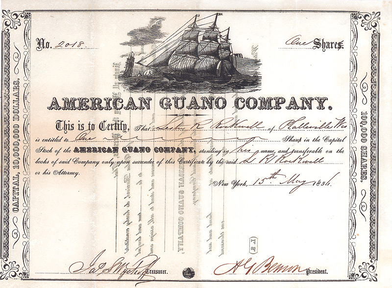| USA Nr. 1765 Schätzpreis: 350,00 EUR Startpreis: 175,00 EUR Alabama Great Southern Railroad 2 share à 50 $, Nr. 25 New York, 27.11.1895 Erhaltung: VF+ Gründung 1877 als Nachfolgegesellschaft der Konkurs gegangenen Alabama & Chattanooga RR. Hauptstrecke Wauhatchie, Tenn. nach Meridian, Miss. (290 Meilen). Außerdem Betrieb der 24 Meilen langen Belt Railway of Chattanooga. Abb. einer weibl. Gestalt, die sich auf einem Spiegel abstützt. Ausgestellt auf die Alabama Great Southen Railway. Nur 8 Stücke wurden im Archiv der Southern Railway gefunden. Nr. 1766 Schätzpreis: 180,00 EUR Startpreis: 90,00 EUR American Dredging Co. 10 shares à 100 $, Nr. 718 Philadelphia, 23.4.1877 Erhaltung: EF/VF Die am 9.4.1867 gegründete Ausbaggerungsgesellschaft besaß Werksanlagen in Camden, N.J. Wunderschöne Aktiengestaltung mit drei Vignetten und herrlich kalligraphisch verzierten Initialen im Firmennamen. Äußerst selten. Nr. 1767 Schätzpreis: 2.000,00 EUR Startpreis: 1.000,00 EUR Photo American Guano Company 1 share à 100 $, Nr. 2018 New York, 15.5.1856 Erhaltung: VF „Der Guano wirkt Wunder, obgleich er kein Heiliger ist“ (peruanisches Sprichwort). Der Begriff Guano bzw. „Huanu“ entstammt der Inka-Sprache Quechua und wurde erstmals für Seevögelexkremente benutzt, die man auf Inseln der peruanischen Küste fand. Die Verwendung von Vogelexkrementen als Düngemittel war schon frühzeitig bei den Arabern bekannt Die Idee der mineralischen Düngung wurde 1840 von Justus von Liebig (1803-1873) entwickelt. Liebig vertrat die Auffassung, daß Pflanzen lediglich zehn Elemente benötigten, um ausreichend ernährt zu werden, wobei Stickstoff, Phosphor und Kalisalze als essentielle Nährstoffe galten (Gesetz des Minimums). Die Spurenelemente entdeckte man erst Anfang des 20. Jahrhunderts. Liebigs Lehren beinflußten die europäische Landwirtschaft in starkem Maße, was zu einem fortwährend steigenden Bedarf an mineralischen Düngemitteln führte. Die Gründung einer modernen Düngemittelindustrie geht somit auf Liebig zurück. Zunächst jedoch besann man sich auf den Guano, von dem man wußte, daß er ein ausgezeichneter Stickstoff- und Phosphordünger war. Es entwickelte sich ein lebhafter Handel. Der erste Versuch, Guano als Düngemittel nach Europa einzuführen, wurde im Jahr 1832 unternommen, war jedoch zunächst von geringem Erfolg. Erst acht Jahre später sandte das peruanische Handelshaus Quiros, Allier & Co., Lima, eine Ladung nach Liverpool, die dort im Auftrag der Britischen Gesellschaft für Ackerbau untersucht wurde. Die Düngeversuche verliefen diesmal überaus erfolgreich. Im März 1841 begann bereits der Export von peruanischem Guano nach England und in die Seehäfen Hamburg, Antwerpen und Bordeaux. Aufgrund dieser Entwicklung erteilte nun die peruanische Regierung verschiedenen Handelshäusern Kontrakte, die dadurch ermächtigt wurden, auf Rechnung der Regierung und gegen Kommissionsgebühren Guano-Handel zu treiben. Den europäischen Handel übertrug man zunächst der Firma Anthony Gibbs & Sons in London. Im Jahr 1861 wurden J. D. Mutzenbecher & Söhne in Hamburg und Aug. Jos. Schön & Comp. alleinige Importeure des Peru-Guanos für Deutschland, Dänemark, Schweden, Norwegen und Rußland. Auf den Chincha-Inseln (Peru) wurde das ganze Jahr hindurch Guano abgebaut und auf die Schiffe, die vor den Inseln lagen, verladen. Hauptverlader waren englische und nordamerikanische Schiffseigner. Im Jahr 1861 wurden beispielsweise 376.667 t (RT) verladen, was der Regierung einen Reingewinn von knapp 17 Millionen US-Dollar einbrachte. In Europa waren die Engländer Hauptabnehmer für den Guano, gefolgt von Frankreich, Deutschland und Belgien. Allein im Jahr 1870 wurden 520.000 t Peru-Guano nach Deutschland eingeführt. Die phosphorsauren Guano-Salze fanden in England bei der Fabrikation von Zündhölzern Verwendung. Neben den englischen Häfen entwickeln sich Antwerpen, Bordeaux und Hamburg zu Drehscheiben des Düngerhandels. Die Nachfrage ist groß, das Angebot knapp, also liegen die Preise konstant hoch. 1843 entdeckten die Briten auf der Insel Ichaboe in der Lüderitzbucht vor der Küste des heutigen Namibia lohnende Vorkommen. Innerhalb von nur 15 Monaten schürfen die Briten 300.000 Tonnen Guano, und schon sind sie auf der Suche nach neuen Lagerstätten. Die britische Landwirtschaft giert nach Dünger. Hunderttausende Tonnen werden von den Klippen gehauen und verschifft, allein im Jahr 1861 sind es 367.667 Tonnen. Auch in den Vereinigten Staaten, wo man den Segen der Vogelexkremente anfangs komplett verschlafen hat, reißen sich die Farmer jetzt um die Vogelphosphate. Vergeblich versuchen die Nordamerikaner mit Peru eine exklusive Sonderbehandlung zu vereinbaren, aber die britischen Handelshäuser sitzen fest im Sattel: keine Rabatte für Kunden aus den USA. 1856 verabschiedet der US-Kongress den Guano Act: Wo immer ein Bürger der Vereinigten Staaten ein Vorkommen von Guano entdeckt, sei es auf unbewohnten Inseln oder den ihnen vorgelagerten Felsen, darf er diese im Namen des amerikanischen Präsidenten in Besitz nehmen. Das Gesetz löst eine Welle von Unternehmensgründungen aus, American Guano und US Guano Company werden aus der Taufe gehoben, Phoenix Guano, die Atlantic & Pacific Guano Company und viele andere. Die Logbücher von Entdeckern und Walfängern werden hervorgeholt und auf Hinweise durchforstet, Expeditionen ausgerüstet, Schiffe in alle Himmelsrichtungen losgeschickt. Die Guanokundschafter arbeiten schnell und gründlich, binnen kurzem machen sie 94 Inseln aus, auf denen profitable Vorkommen lagern. 66 davon erklärt das State Department umgehend zu amerikanischem Besitz, auf 24 Eilanden beginnt das große Graben. Jetzt weisen die Karten des 19. Jahrhunderts zwar noch den einen oder anderen weißen Fleck auf, aber die von den USA beanspruchten Inseln gehören nicht in jedem Fall dazu. Sombrero Island beispielsweise. Die Prospektoren der New Yorker Firma Wood & Grant hiss