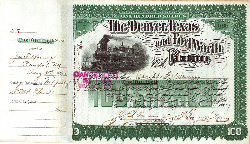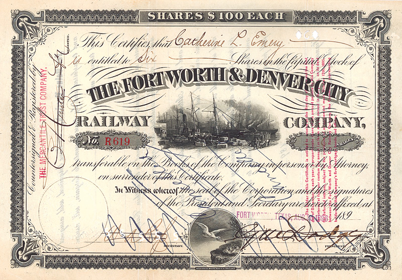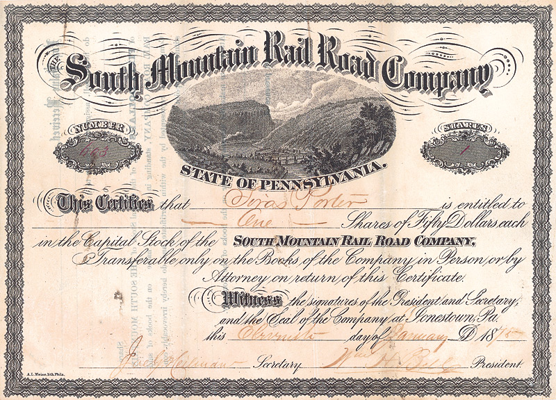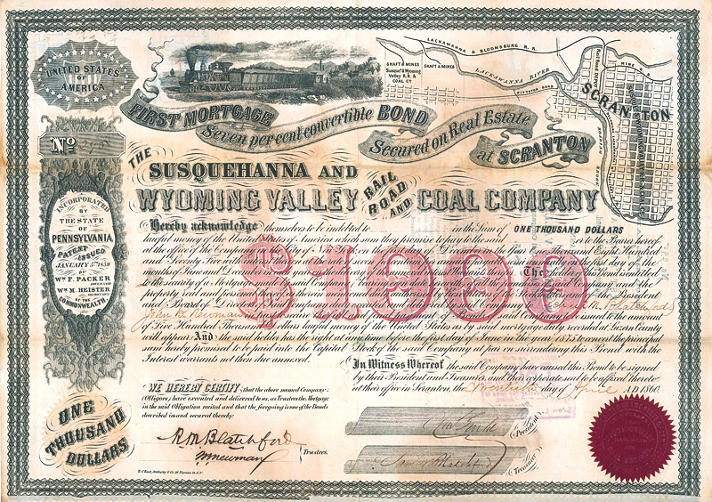 Nr. 1974 Schätzpreis: 300,00 EUR Startpreis: 150,00 EUR State of Tennessee, Cr. 61A (R8) 6 % Bond 1.000 $, Nr. 4202 Nashville, 1.6.1864 Erhaltung: VF Sehr dekorative Vignette mit Regierungspalast. Original signiert von dem bedeutenden Politiker Isham Green Harris (1818-1897) als Gouverneur des Staates Tennessee (1857-1862). Harris war US-Senator ab 1877. Knickfalten, nur leicht gebräunt, insgesamt sehr schöne Erhaltung. Mit 15 anh. restlichen Kupons. Einzelstück aus einer alten Sammlung. Nr. 1975 Schätzpreis: 200,00 EUR Startpreis: 100,00 EUR Sunbury, Hazleton & Wilkesbarre Railway 5 shares à 50 $, Nr. 50 Philadelphia, 25.1.1893 Erhaltung: EF- Autograph: Samuel Rea. Konzessioniert 1859 als Danville, Hazleton & Wilkesbarre, eröffnet 1879. Strecke Sunburry - Tombicken, Pa. (43 Meilen). Am 20.3.1878 verkauft und reorganisiert am 1.5.1878 als Sunbury, Hazleton & Wilkesbarre Ry. An die Pennsylvania RR Co. verpachtet und als Untergesellschaft der Philadelphia & Erie RR Co. geführt. Stahlstich mit zwei Vignetten: Bergleute unter Tage und Eisenbahnen auf langer Brücke. Ausgestellt auf den bedeutenden Eisenbahn-Promoter Samuel Rea und mit seiner zweifachen Originalsignatur: vorderseitig als Präsident (lochentwertet, wie bei allen bekannten Stücken) und auf dem rückseitig angeklebtem Transferzertifikat (nicht entwertet!!!). Samuel Rea (1855-1929), Eisenbahn-Ingenieur, 1913-1925 Präsident der Pennsylvania Railroad, wurde bekannt als Erbauer einiger der imposantesten Eisenbahnkostruktionen des XX. Jahrhunderts, u.a. konstruierte er den Bahnhof Pennsylvania Station im New Yorker Stadtteil Manhattan (1910). Seine Originalsignatur auf historischen Wertpapieren ist extrem selten. Siehe auch das Los Nr. 1941. Nr. 1976 Schätzpreis: 1.300,00 EUR Photo Startpreis: 650,00 EUR Susquehanna & Wyoming Valley Rail Road & Coal Co. 7 % First Mortgage Bond 1.000 $, Nr. 295 Scranton, 20.4.1860 Erhaltung: VF- Gegründet 1859 für den Bau und Betrieb von Bahnstrecken von den Kohleminen der Gesellschaft über den Lackwanna River mit Anschluß an die Lackwanna & Bloomsburg RR und an die Delaware, Lackwanna & Western Railroad. Eine zweite Strecke führte von den Minen zum Lackvanna River und eine Lonie über die Pittston Road nach Scranton zum Depot. In den Kohleminen der Ges. wurden 500 Männer und Jungen beschäftigt. Großformatiges Papier, einmalig gestaltet mit Eisenbahnvignette und Lageplan von Scranton. Mehrere Originalsignaturen, u.a. von R.M. Blatchford und J.B. Newman las Trustees. 1870 wurden die beiden vom US Supreme Court angeklagt, ihre Pflicht als Treuhänder verletzt zu haben, nachdem die Susquehanna & Wyoming Valley Rail Road & Coal Co. zahlungsunfähig wurde, die Pfandabwicklung durchzuführen. Knickfalten stellenweise gebräunt, leichte Verfärbungen, Couponabschnitt am unteren Rand, kein Papierverlust. Rarität. Nr. 1977 Schätzpreis: 400,00 EUR Startpreis: 200,00 EUR Tacoma, Orting & Southeastern Railroad 1 share à 100 $, Nr. 14 Tacoma, W.T., 8.5.1896 Erhaltung: EF- Bahn von Orting (südöstlich von Tacoma) aus 11 Meilen nach Süden am Puyallup River entlang. Nur 14 ausgestellte Stücke wurden im NP-Archiv gefunden. Nr. 1978 Schätzpreis: 350,00 EUR Startpreis: 175,00 EUR Tennessee Railway 5 % Gold Bond 1.000 $, Nr. 131 Tennessee, 1.3.1907 Erhaltung: EF/VF Auflage: 900. Der Name ist etwas großspurig: Die bei der Gründung 1904 übernommene von Oneida, Tenn. ausgehende Privatbahn war gerade einmal 6 Meilen lang. Sie wurde dann kontinuierlich verlängert und erreichte 1908 das 35 Meilen entfernte Straight Fork, Tenn. 1918, inzwischen waren weitere 25 Meilen bis Charley’s Branch in Betrieb, ging die Bahn pleite. An ihre Stelle trat nach Reorganisation die Tennessee Railroad. Mit anhängenden restlichen Kupons. Nur 14 Stücke wurden 2005 in England gefunden. Nr. 1979 Schätzpreis: 900,00 EUR Photo Startpreis: 450,00 EUR Territory of Florida, Cr. 38A (R9) 6 % Bond 1.000 $, Nr. 2054 Tallahassee, 1.1.1838 Erhaltung: VF Autograph: Richard Keith Call. 1819 verkaufte Spanien Florida gegen einen geringen Betrag an die USA. Andrew Jackson wurde Militärgouverneur von Florida. Der Staat Florida war damals eine kaum besiedelte, im Süden sumpfige Wildnis, ohne Infrastruktur, mit feindseligen indianischen Seminolen-Stämmen. Um den Bau von Straßen, Eisenbahnen, Industrie und Wachposten finanzieren zu können, begab die territorial Regierung von Florida verschiedene Anleihen, aufgelegt u.a. durch die Union Bank (1835-1838), Bank of Penascola (1836) und Southern Life Insurance & Trust Co. (1839). Die Anleihe wurde teilweise in Europa platziert. Originalunterschrift des Gouverneurs Richard Keith Call (1792-1862), Amtszeit 1836-1839 als Protegé von Andrew Jackson (1829-1837 Präsident der USA). Call kommandierte die US-Truppen im zweiten Seminolen Krieg (1835-1842). Unter der Führung von Osceola stellten sich die Seminolen 1835 den USA. Die Indianer waren zunächst erfolgreich, da sie sich durch einen Guerillakrieg die Sümpfe nutzbar machen konnten. Die US-Armee geriet durch Unkenntnis der Umgebung in die Defensive. 1837 konnte sie aber Osceola gefangen nehmen und nach Fort Moultrie in South Carolina bringen, wo er starb. Seine Stammesgenossen führten den Krieg unvermindert gegen die von Call angeführten Truppen weiter. 1840 änderte die US-Armee ihre Taktik. Sie vermied den direkten Feindkontakt und zerstörte die indianischen Vorräte für den Lebensunterhalt. Nach etwa 6 Monaten gaben immer mehr Seminolen auf. 1842 waren nur noch ein paar hundert Seminolen in den unzulänglichen Teilen der Everglades übrig. Die US-Armee hatte kein Interesse mehr, den Krieg fortzuführen und zog sich zurück. Erst 1931 unterzeichneten die Seminolen einen Friedensvertrag mit der US-Regierung. Großformatiges Papier mit 5 Kupferstich-Vignetten: Dampfschiffe, Bäuerin bei der Getreideernte, Farmer bei der Maisernte, dampfende Eisenbahn. Mit restlichen Kupons ab 1842. Unentwertet. Ein geschichtsträchtiges Papier,