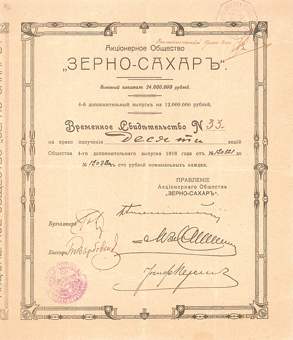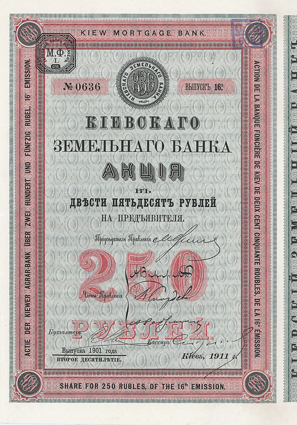 Auflage: 2.500. Gründung 1918 in Lancut (deutsch Landshut), heute polnische Stadt in der Wojewodschaft Karpatenvorland. 1919 geändert in eine AG des polnischen Rechts unter der Firma “Bank Ziemski dla Kresów, Tow. Akc. w Lancucie” (Bodenbank für für Ostpolen AG in Landshut). Das Gründungskapital betrug 1 Mio. Kronen. Die hier angebotene Aktie stammt aus der Kapitalerhöhung von 1 auf 2 Mio. Kronen. Großformatiges Papier, hochdekorativ mit landwirtschaftlichen Motiven verziert. Zweisprachig polnisch/deutsch. Originalsignaturen. Mit anh. Statuten. Extrem selten. (Einlieferer-Nr.: 16)