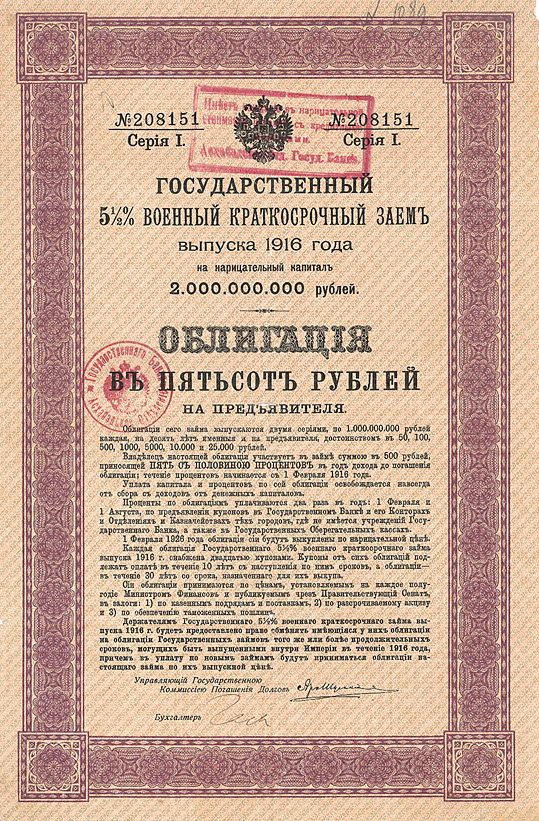 Die Landesbank wurde vom galizischen Landtag 1883 gegündet. Sie bestand aus einer Hypotheken-, Kommunal und Bankabteilung sowie einer Abteilung für Eisenbahndarlehen. Filialen in Krakau ab 1895, in Biala seit 1910 sowie, gemeinschaftlich mit der Galizischen Industriebank in Lublin und Dabrowa-Gornicza ab 1916. Zweisprachig polnisch/deutsch. Originalunterschriften. Sehr dekorativ mit vier Landschafts-Vignetten. Datum handschriftlich eingetragen. Doppelblatt (im Falz eingerissen und hinterklebt), links oben etwas fleckig. (Einlieferer-Nr.: 94)