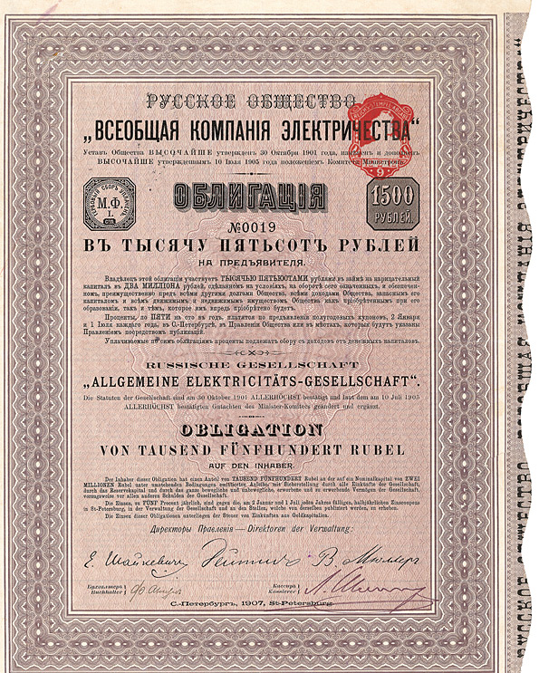 Gegründet am 5.12.1918 in Warschau als die allererste AG in dem unabhängigen Polen mit dem Zweck der Elektrifizierung des Landes. Ab 1920 Bau von Eisenbahn- und Strassenbahnlinien. Hochdekorative und äußerst seltene Aktie der überaus bedeutenden Gesellschaft, die einen entscheidenden Einfluss auf die Industrialisierung des Landes ausgeübt hatte. Mit anh. restlichen Kupons ab 1923. Unterer Rand mit kleinen Einrissen. (Einlieferer-Nr.: 1)