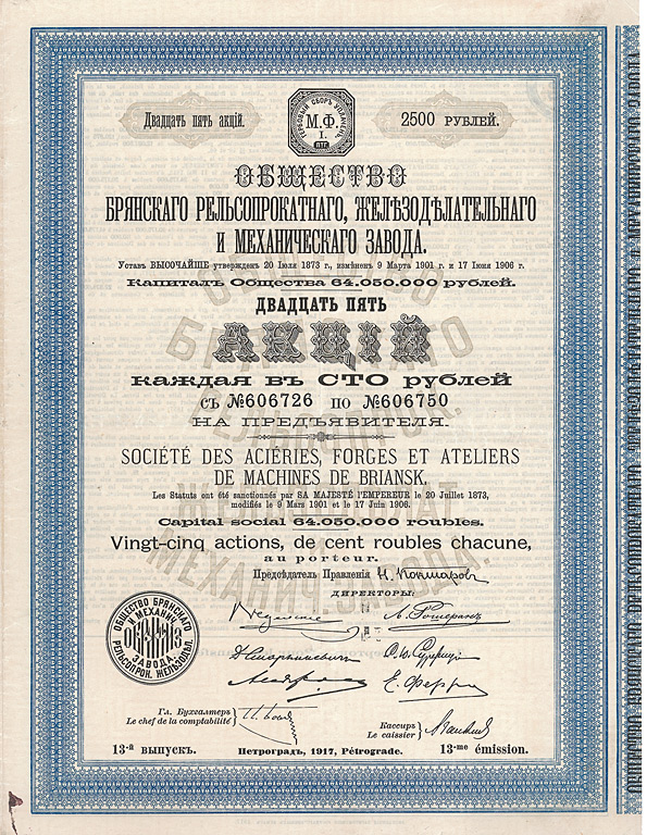 Gründeraktie. Gründung 1921 in Lemberg mit einem Kapital von 20 Mio. poln. Mark. Bau von kompletten Mühlen, Handel mit Mühlereimaschinen, Wasserturbinen und Dampflokomotiven. Großformatiges Papier, großflächig illustriert. Mittig im Unterdruck große Werksansicht aus der Vogelperspektive, in den Ecken versch. Motive, u.a. Wald, säender Bauer, Pflug, Wasserturbine. Doppelblatt, mit restlichem Kuponbogen (Kupons ab Nr. 4). Rarität. (Einlieferer-Nr.: 16)
