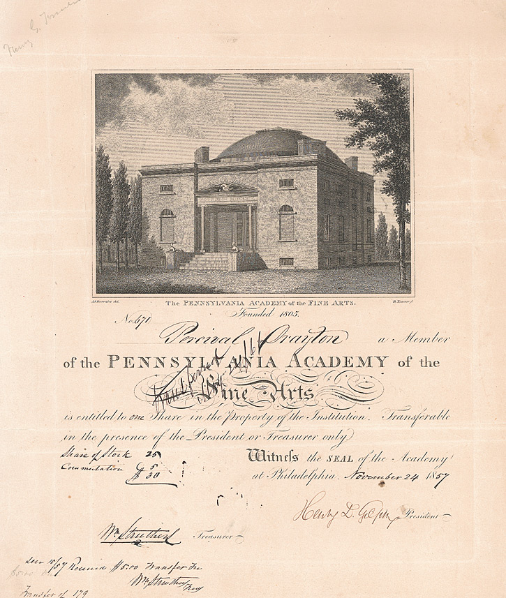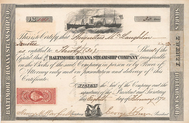 Dieser Verlag hatte ein Aktienkapital von 5.000 $. Eingetragen auf den Chairman der Gesellschaft. Schwarzer Druck auf hellblauem Papier. Mit dem Staatswappen von Pennsylvania: Dreigeteiltes Schild, oben ein Segelschiff auf Wasser, in der Mitte ein Pflug, unten drei Garben; darüber ein amerikanischer Adler. Schildhalter sind zwei Pferde. Auf einem Spruchband: Virtue, Liberty and Independence. Äußerst selten! (Einlieferer-Nr.: 34)