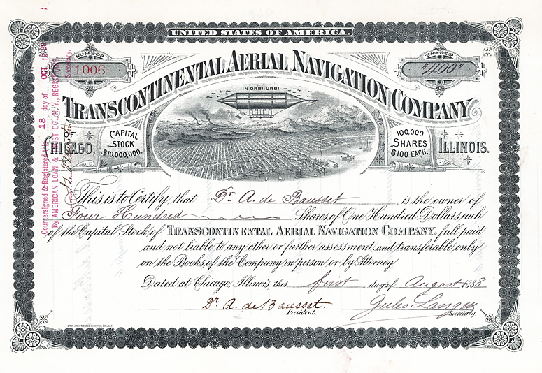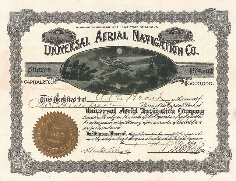 Die 1910 gegründete Gesellschaft konstruierte ein Fluggerät, welches die Vorteile eines Flugzeuges und eines Hubschraubers verband. Mittels dreier Hub-Propeller sollte sowohl ein direkter Aufstieg ohne Startbahn möglich sein, wie andererseits auch ein normaler Start mit von Antriebspropellern. Um die Öffentlichkeit von dem “enormen Wert und der praktischen Anwendbarkeit” dieses Fluggerätes zu überzeugen, sollte die Maschine auf dem Campus der Universität von St. Louis (Missouri) von ihrem Erfinder J.W. Oman vorgestellt werden. Große Vignette mit mehreren Luftschiffen mit haifischähnlichen Konturen, die in mondheller Nacht über die Rocky Mountains fliegen. Das Gyroplane selbst war aus Stahl und Aluminium. Mit Goldsiegel, Originalsignaturen, u.a. W.H. Walters als Präsident. Im Jahr 1997 wurden lediglich 11 Exemplare gefunden. Inzwischen eine große Rarität. (Einlieferer-Nr.: 1)