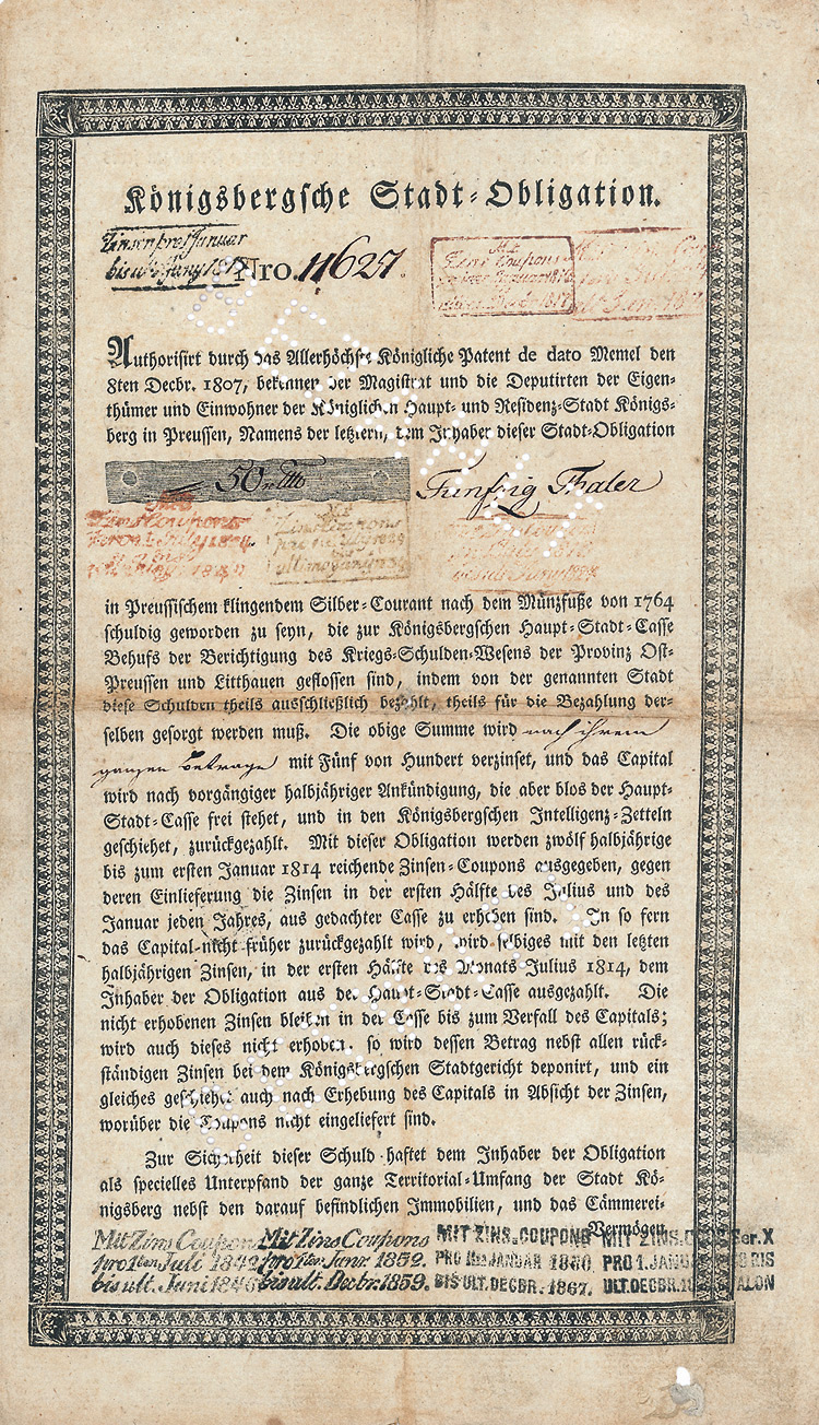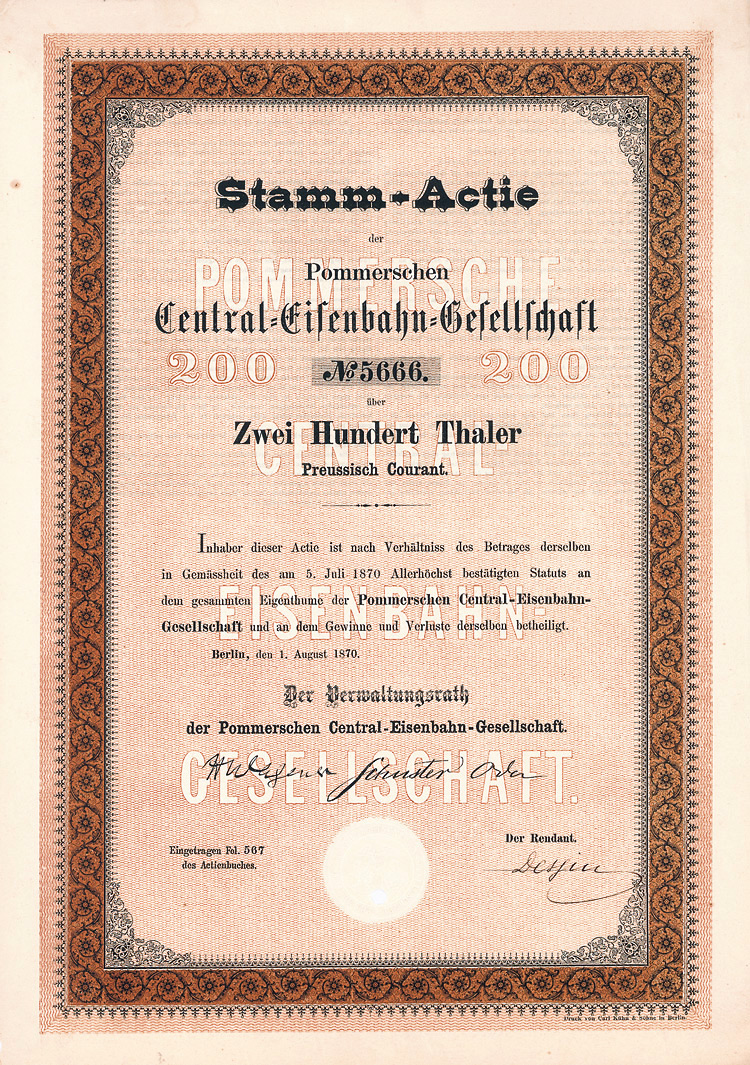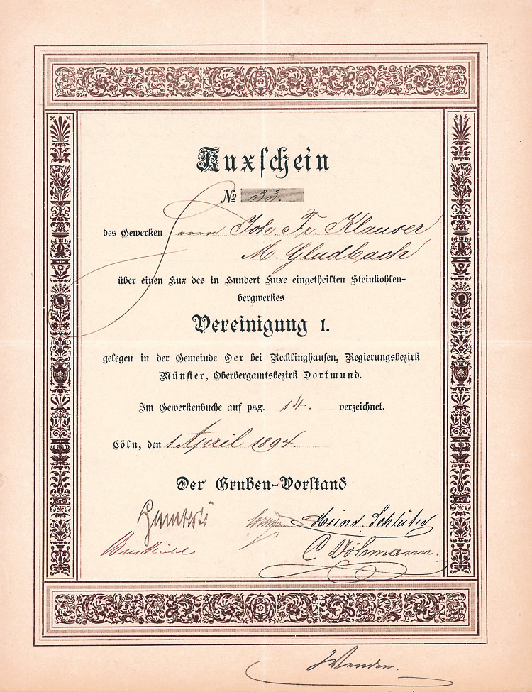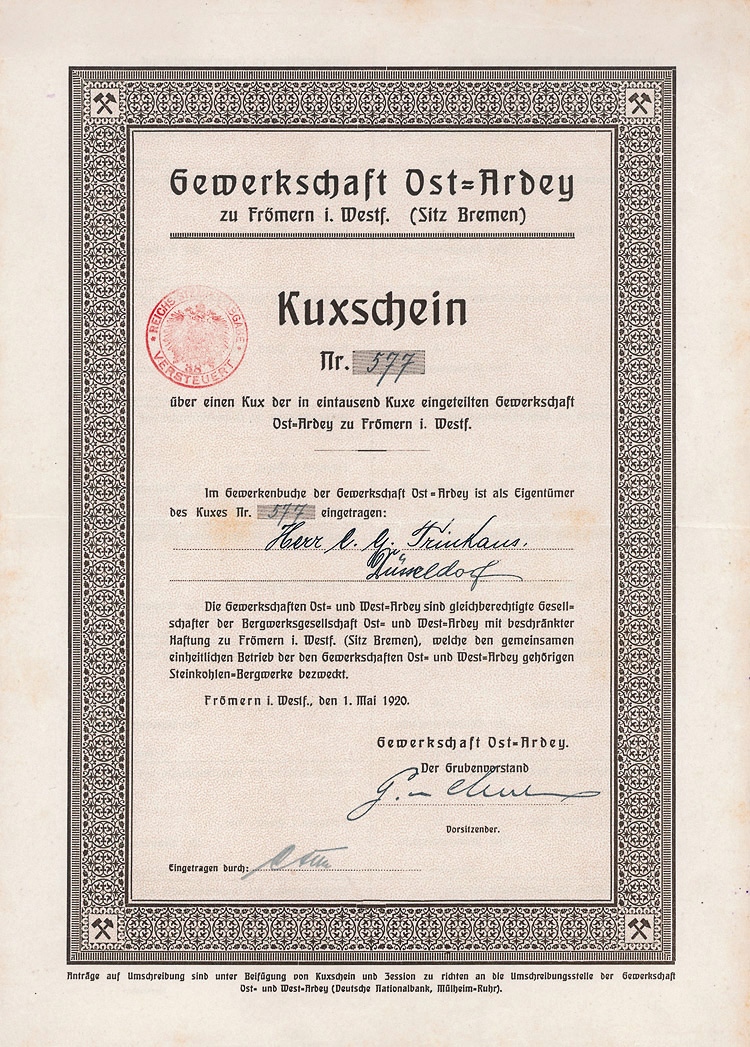 Erhaltung EF/VF Auflage 1.000 (R 10). Die Gewerkschaften Ost- und West-Ardey waren gleichberechtigte Gesellschafter der Bergwerksgesellschaft Ost- und West-Ardey mit beschränkter Haftung zu Frömern i. Westf. (Sitz Bremen), welche den gemeinsamen einheitlichen Betrieb der den Gewerkschaften Ost- und West-Ardey gehörigen Steinkohlen-Bergwerke bezweckte. Eingetragen auf den Bankier Christian Gottfried Trinkaus, den Gründer der bedeutenden Düsseldorfer Privatbank. Unentwertet.