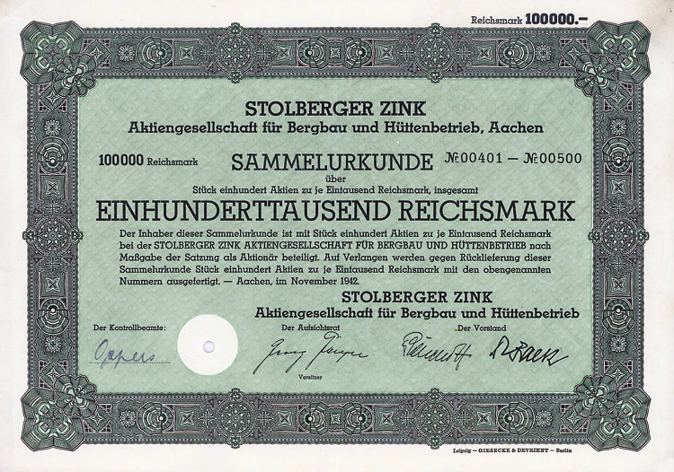 Auflage 1000 (R 9). Die Gruben der Gesellschaft befanden sich in der Gemeinde Mudersbach, Kreis Altenkirchen. Ausgestellt auf das Privatbankhaus C.G. Trinkaus, Düsseldorf. Doppelblatt, original signiert. Mit Lieferbarkeitsbescheinigung. Unentwertet.