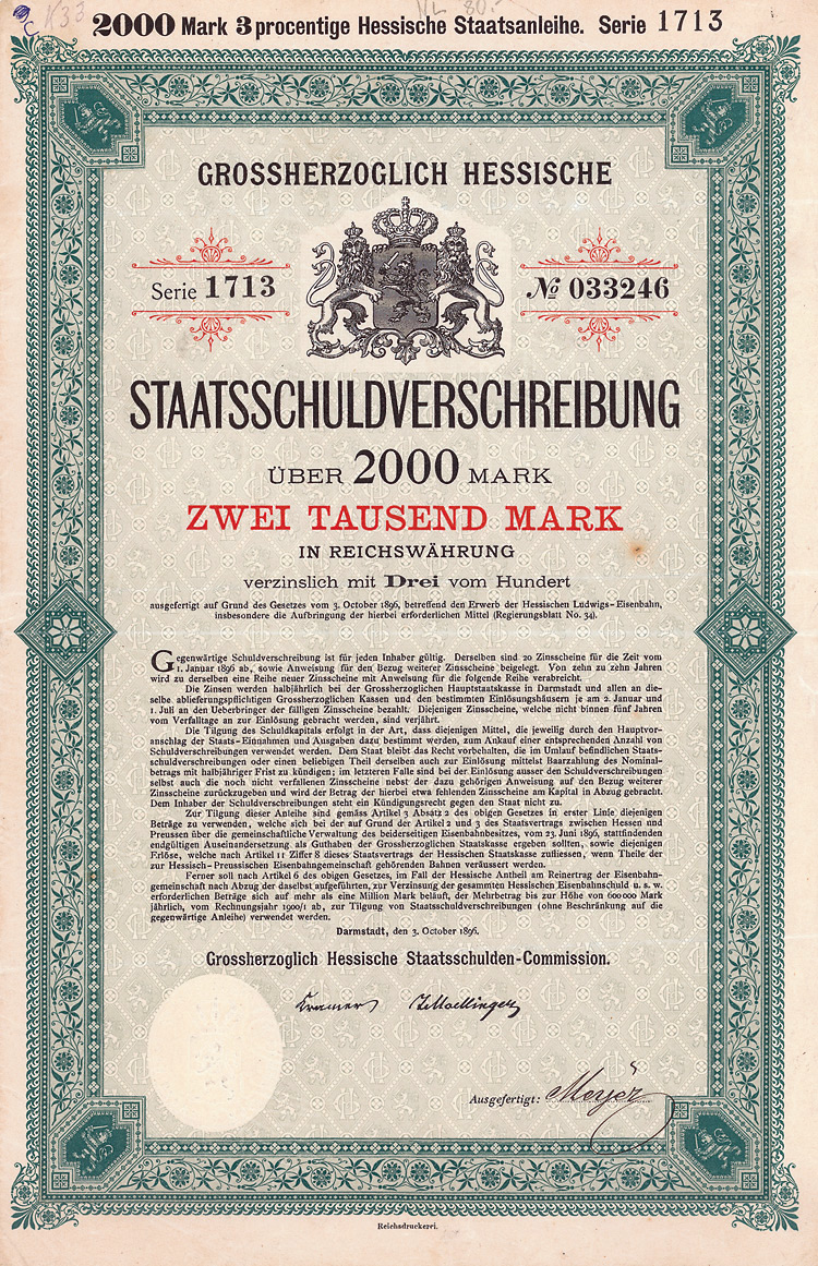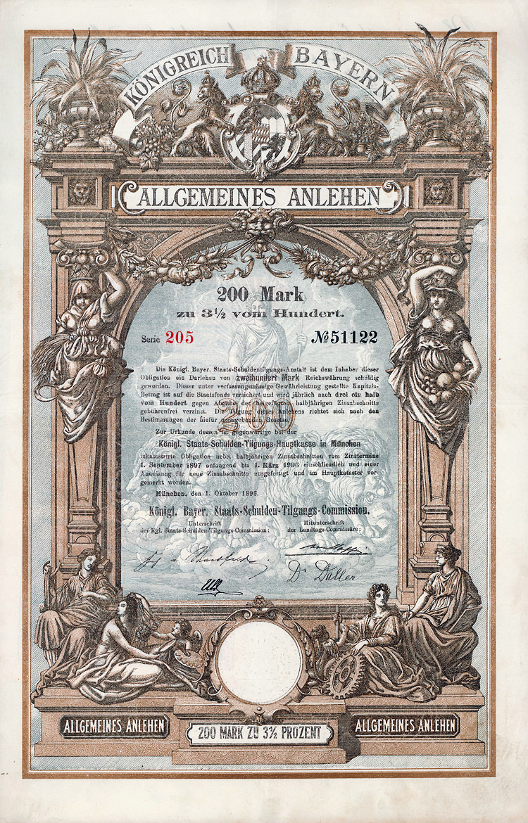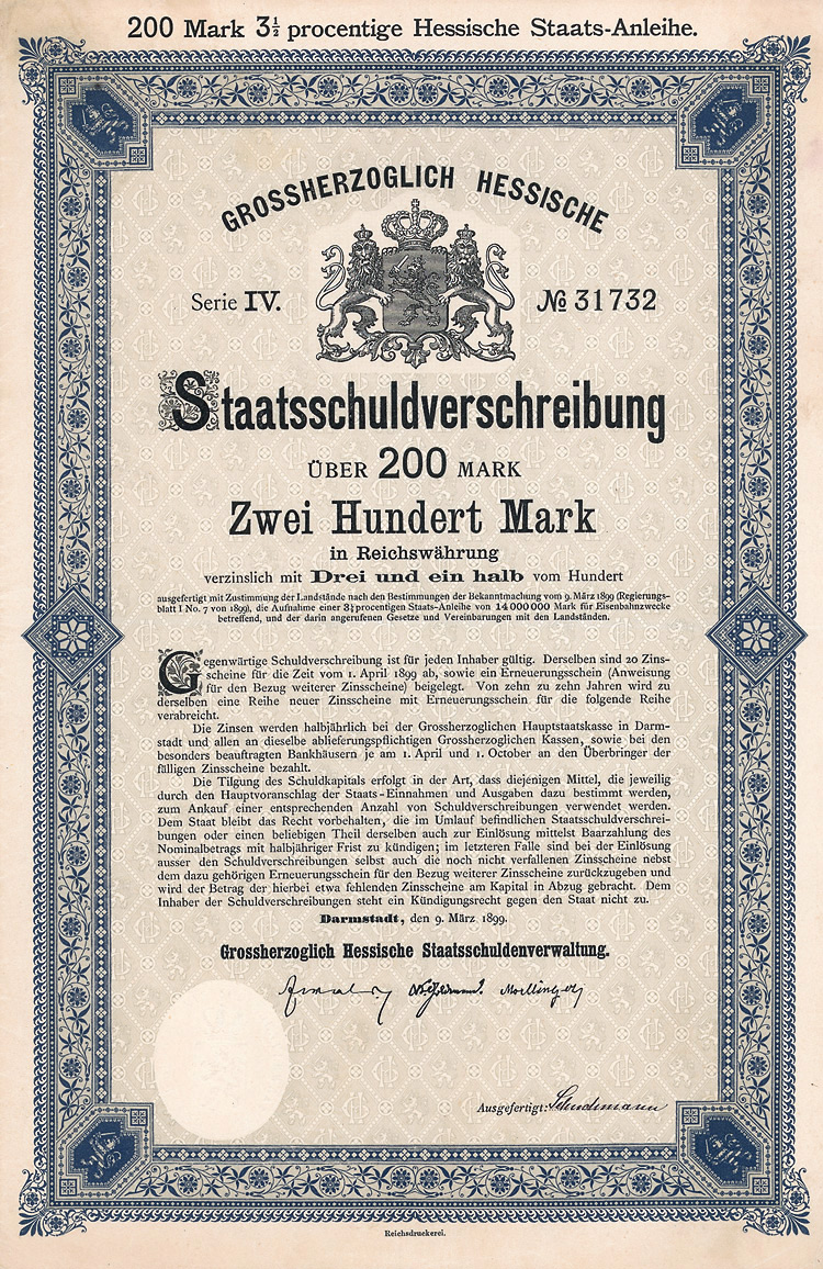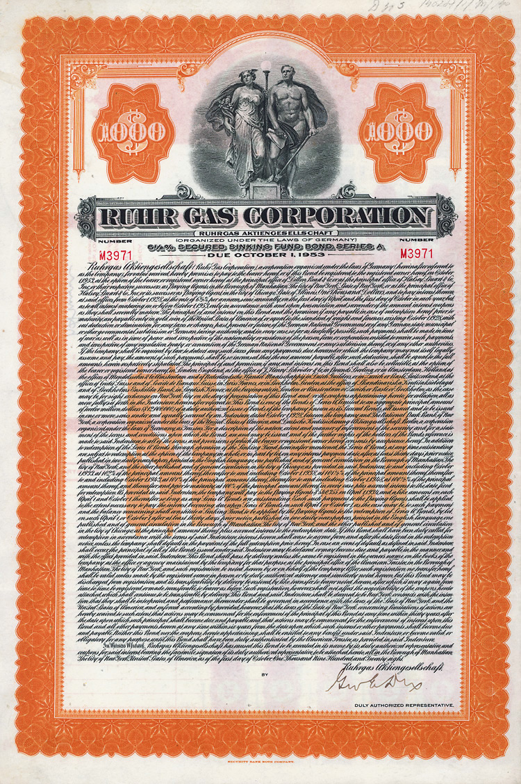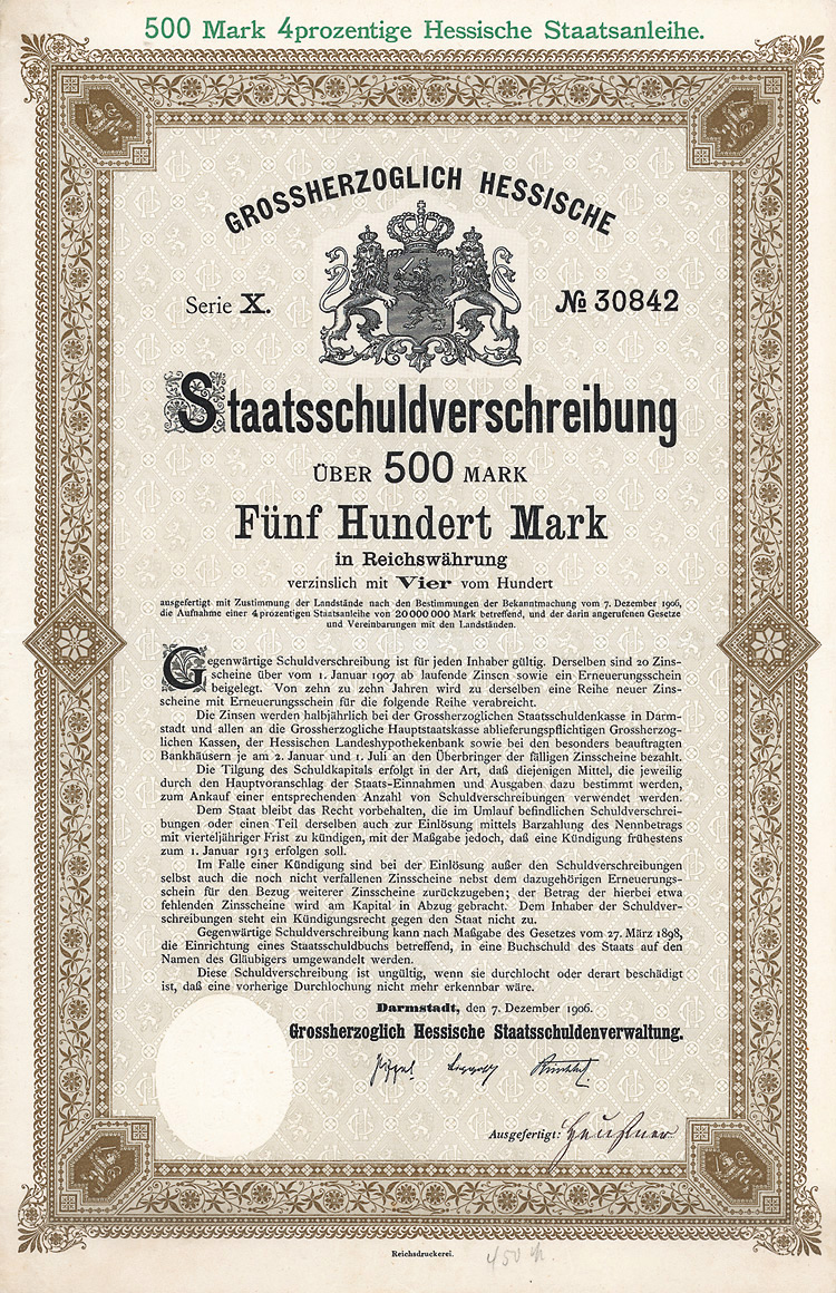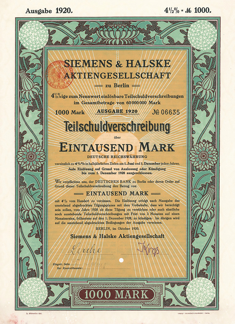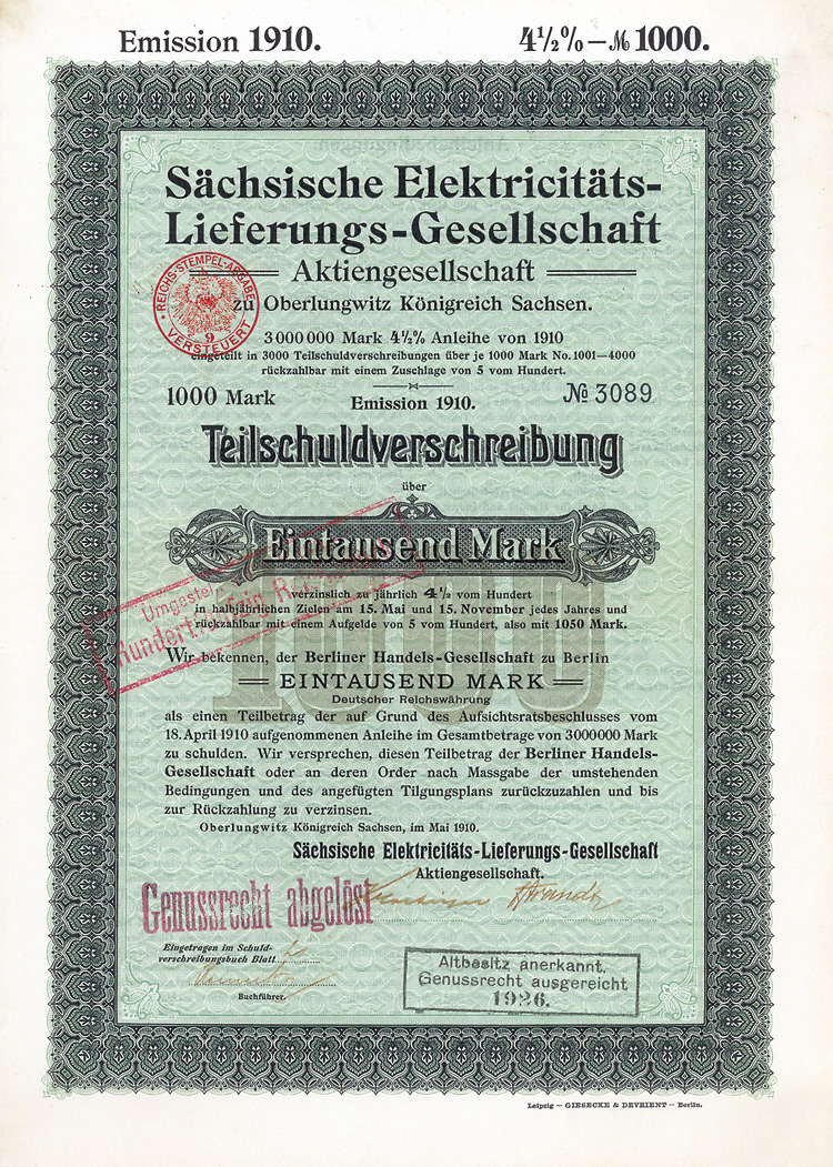 Auflage 250 (R 6). Gründung 1852 als KG unter der Firma “Officin für Geld und Werthpapiere” in Leipzig (Stammhaus) und Berlin (dort saßen das Börsengeschäft und damit die großen Kunden), 1931 in eine AG umgewandelt. Beide Betriebsstätten (Berlin C 2, Wallstr. 27 und Leipzig C 1, Nürnberger Str. 12) lagen dann in der sowjetischen Besatzungszone und gingen dem Unternehmen damit verloren (aus dem Leipziger Betrieb wurde der VEB Wertpapierdruck der DDR). 1948 Sitzverlegung nach München, 1958 Umwandlung in eine GmbH. Schon früh hatte sich die Firma auf den Wertpapierdruck spezialisiert, wo sie in Deutschland das mit Abstand bedeutendste und fähigste Unternehmen wurde. Heute ist G&D zudem Technologieführer bei Smart Cards und Systemlösungen für die Bereiche Telekommunikation, elektronischer Zahlungsverkehr, Personenidentifizierung, Gesundheit, Pay TV, Multimedia- und Internetsicherheit. Bis heute im Besitz der Familie. Lochentwertet. Doppelblatt, inwendig Anleihebedingungen. Nur 66 Stücke lagen in der Reichsbank.