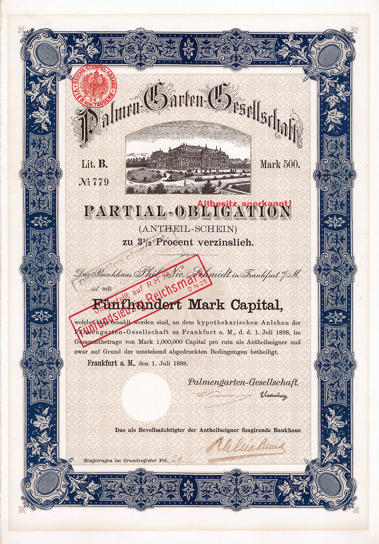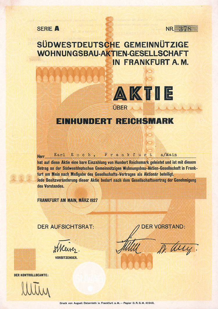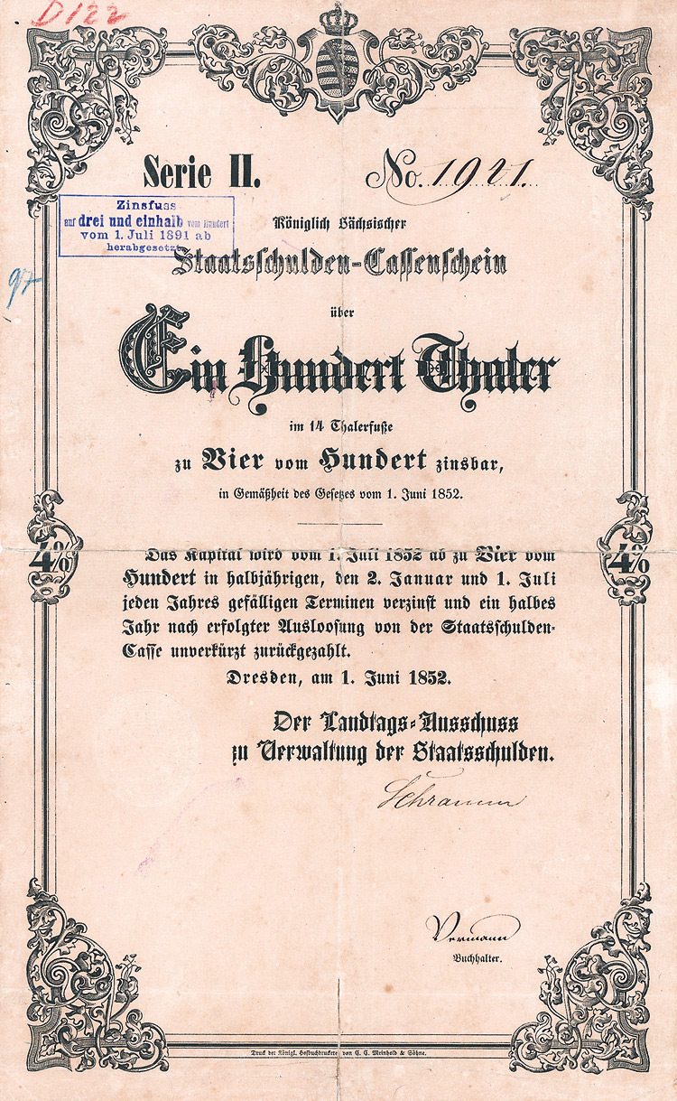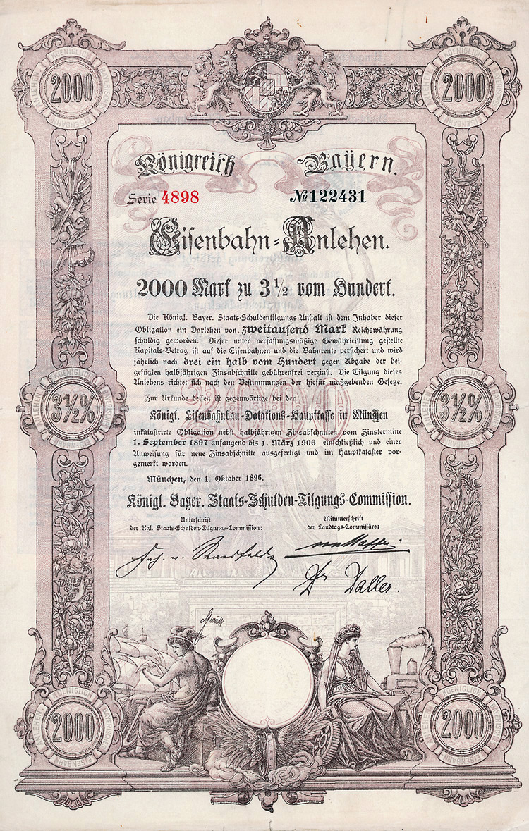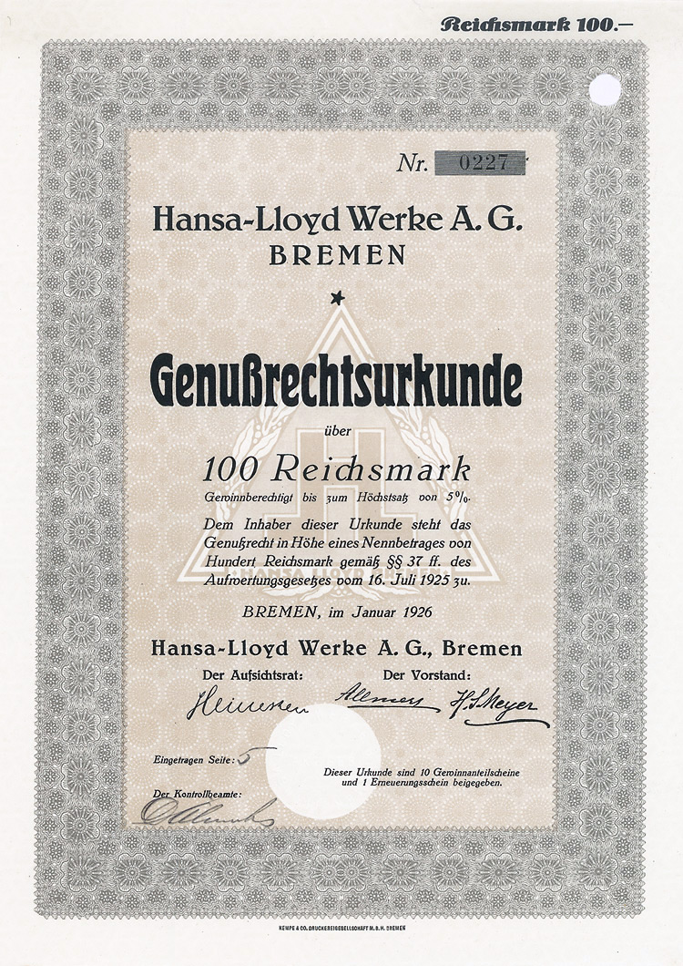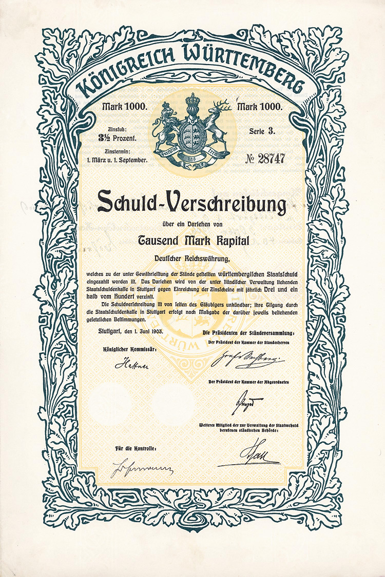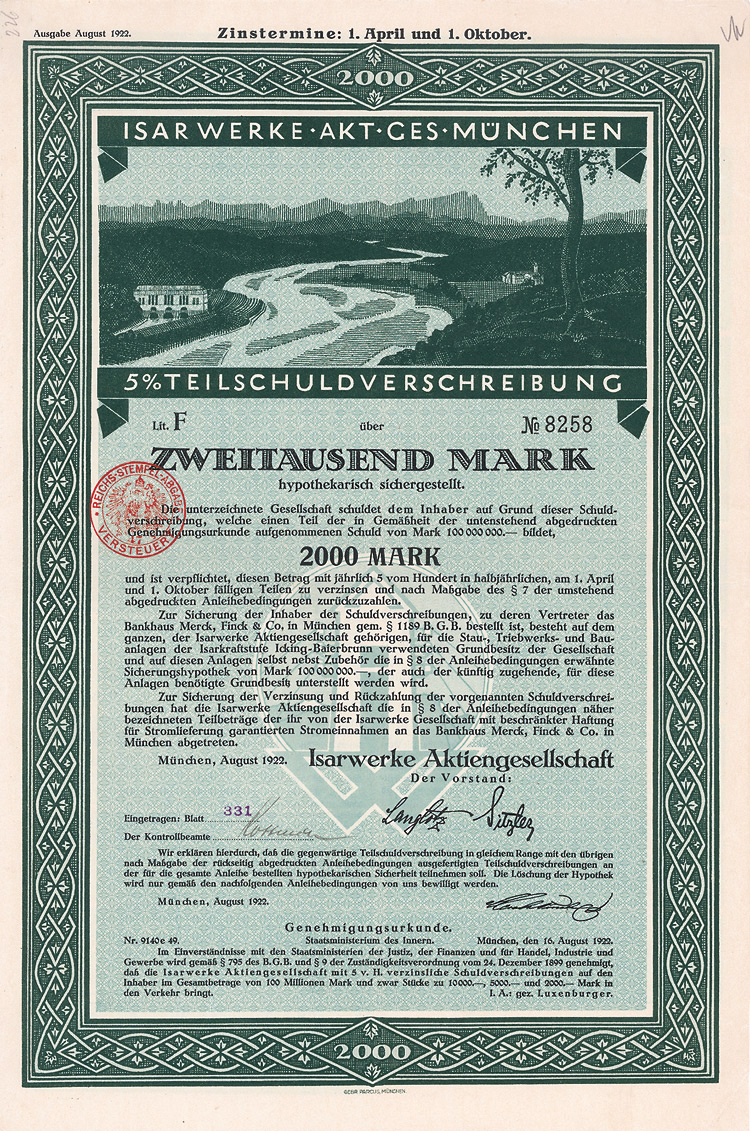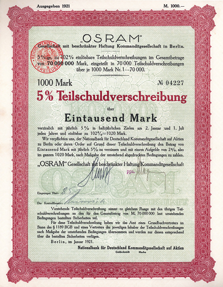 Auflage 250 (R 6). Gründung 1852 als KG unter der Firma “Officin für Geld und Werthpapiere” in Leipzig (Stammhaus) und Berlin (dort saßen das Börsengeschäft und damit die großen Kunden), 1931 in eine AG umgewandelt. Beide Betriebsstätten (Berlin C 2, Wallstr. 27 und Leipzig C 1, Nürnberger Str. 12) lagen dann in der sowjetischen Besatzungszone und gingen dem Unternehmen damit verloren (aus dem Leipziger Betrieb wurde der VEB Wertpapierdruck der DDR). 1948 Sitzverlegung nach München, 1958 Umwandlung in eine GmbH. Schon früh hatte sich die Firma auf den Wertpapierdruck spezialisiert, wo sie in Deutschland das mit Abstand bedeutendste und fähigste Unternehmen wurde. Heute ist G&D zudem Technologieführer bei Smart Cards und Systemlösungen für die Bereiche Telekommunikation, elektronischer Zahlungsverkehr, Personenidentifizierung, Gesundheit, Pay TV, Multimedia- und Internetsicherheit. Bis heute im Besitz der Familie. Lochentwertet. Doppelblatt, inwendig Anleihebedingungen. Nur 66 Stücke lagen in der Reichsbank.