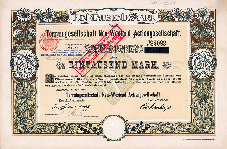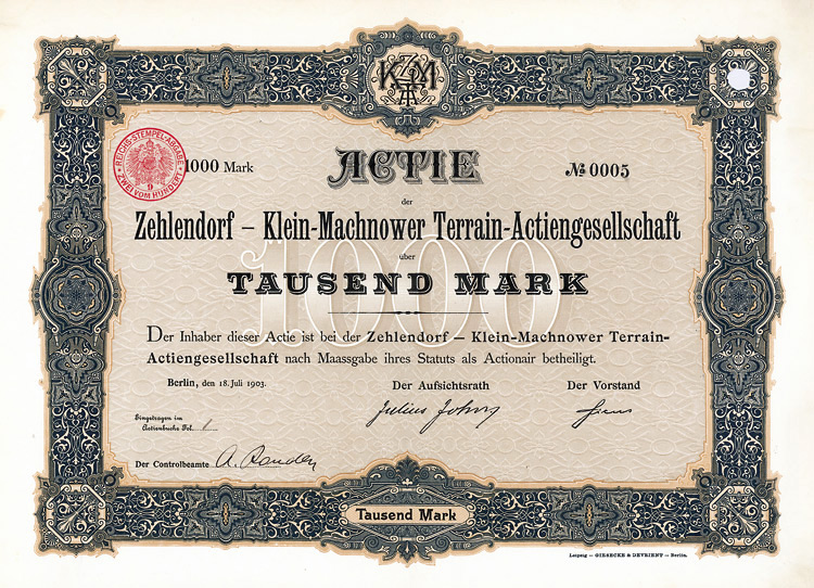 Gründeraktie, Auflage 100 (R 7). Die am 18.7.1903 gegründete Gesellschaft erwarb das Rittergut Klein-Machnow und erschloß die Flächen für die Bebauung mit Villen und Einfamilienhäusern. 1914 wegen undurchsichtiger Finanzoperationen Zwangsversteigerung der Grundstücke und anschließende Liquidation. Lochentwertet.