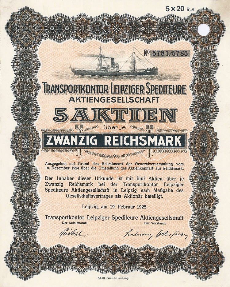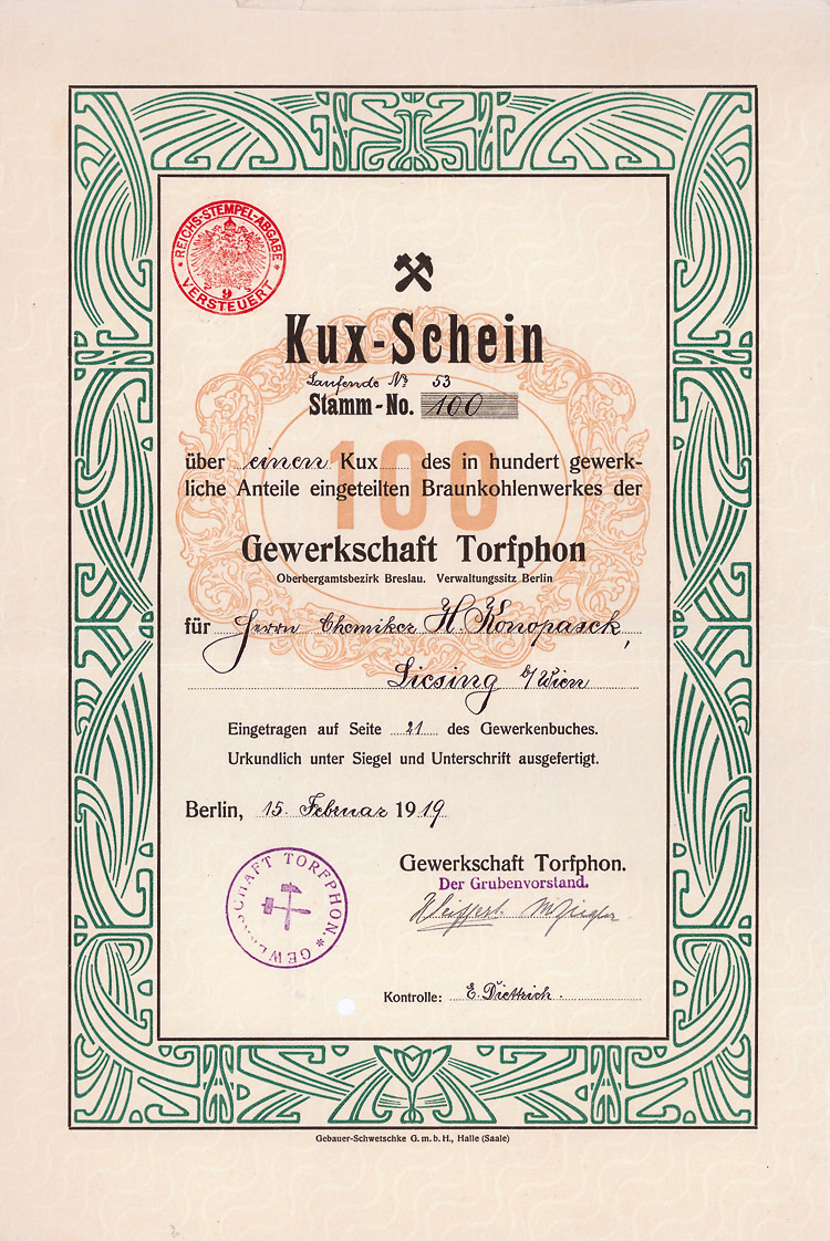 Auflage 1.000 (R 7). 1830 läßt Heinrich von Helldorf in Bedra (heute Braunsbedra) in Neumark eine Zuckersiederei in Betrieb gehen. Die Braunkohlenvorkommen der Gegend sind die Lösung für den Energiebedarf der Zuckersiederei: 1832 läßt von Helldorf auf dem Petzkendorfer Feld einen Kohleschacht anlegen. Später entsteht das Braunkohlenwerk “Pfännerhall”. 1910 beginnt im Merseburger Revier in großem Stil der Braunkohlen-Tagebau durch den Michel-Konzern, dessen gesellschaftsrechtliche Grundlage mehrere ursprünglich in Köln domizilierende bergrechtliche Gewerkschaften sind (neben der Gewerkschaft Leonhardt, die ursprünglich auf dem Dachschieferbergwerk zu Lützendorf, Lkr. Limburg-Weilburg, verliehen war, u.a. die Gewerkschaften Michel, Vesta, Gute Hoffnung Halle, Prinzessin Victoria). Die Gewerkschaft Leonhardt, Verwaltungssitz Großkayna, betreibt einen 327 ha großen Tagebau in Neumark bei Merseburg. 1949 werden die Gewerkschaft Leonhardt und die Gruben Tannenberg und Otto zum VEB Braunkohlenwerk Neumark vereinigt. 1960 Zusammenschluß mit dem Braunkohlenwerk Pfännerhall zum VEB Braunkohlenwerk Geiseltal-Mitte. 1995 Stilllegung der Brikettfabrik “Pfännerhall”, 1998 werden “300 Jahre Braunkohleabbau im Geiseltal” gefeiert. Am 30.6.2003 beginnt die Flutung des Tagebau-Restloches Mücheln/Geiseltal, bis 2010 entsteht mit 1.842 ha Fläche das größte künstliche Gewässer Deutschlands. Sehr schöne barocke Umrahmung. Inwendig vielfältige Übertragungsvermerke, zuletzt 1934 auf Herrn Hans Thyssen, Mülheim-Ruhr. Originalsignaturen. Lochentwertet.