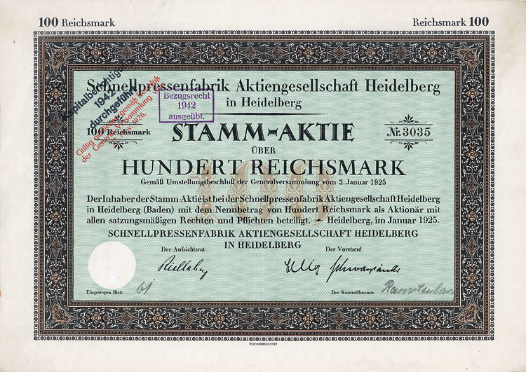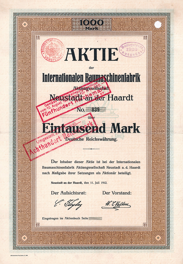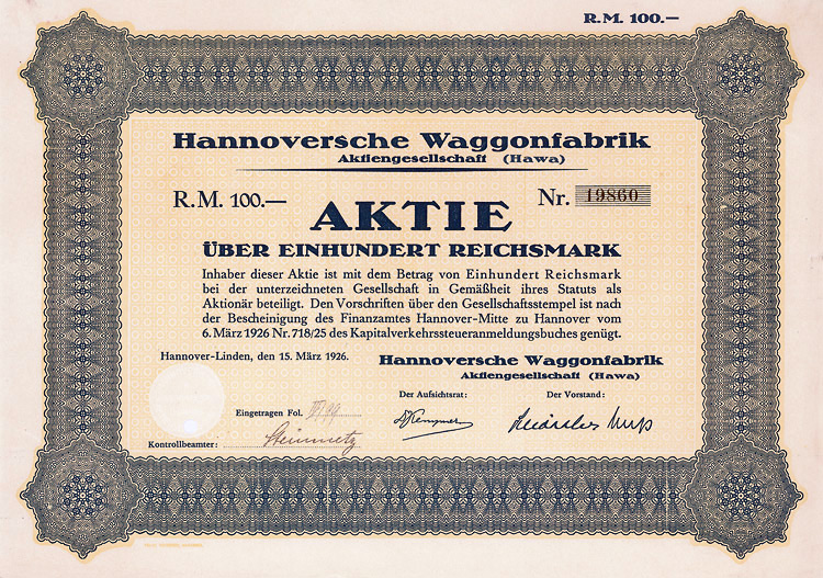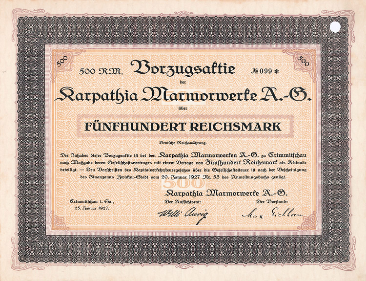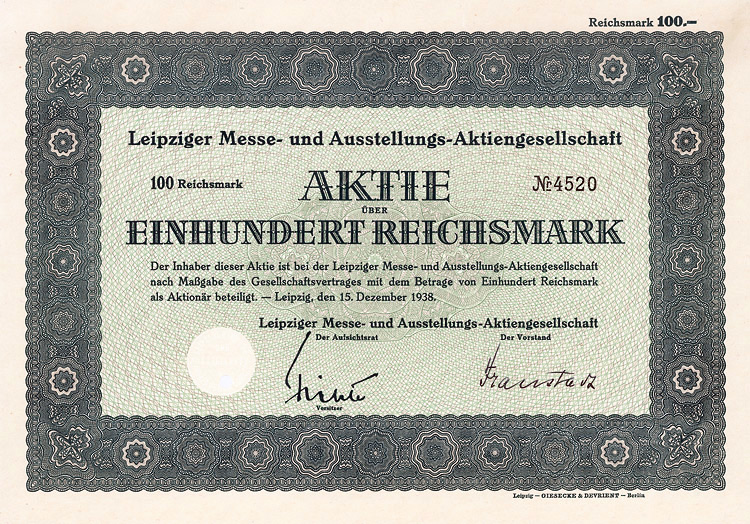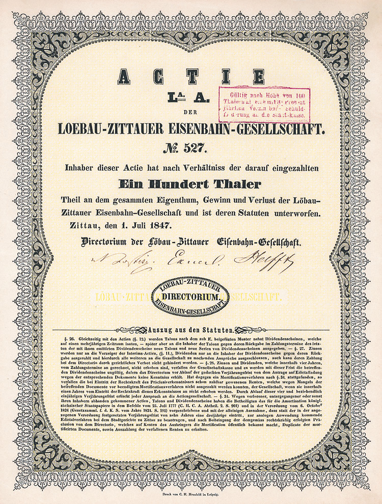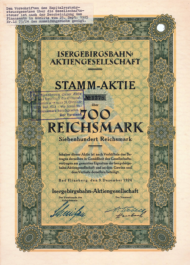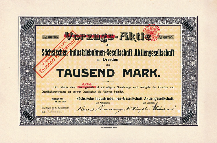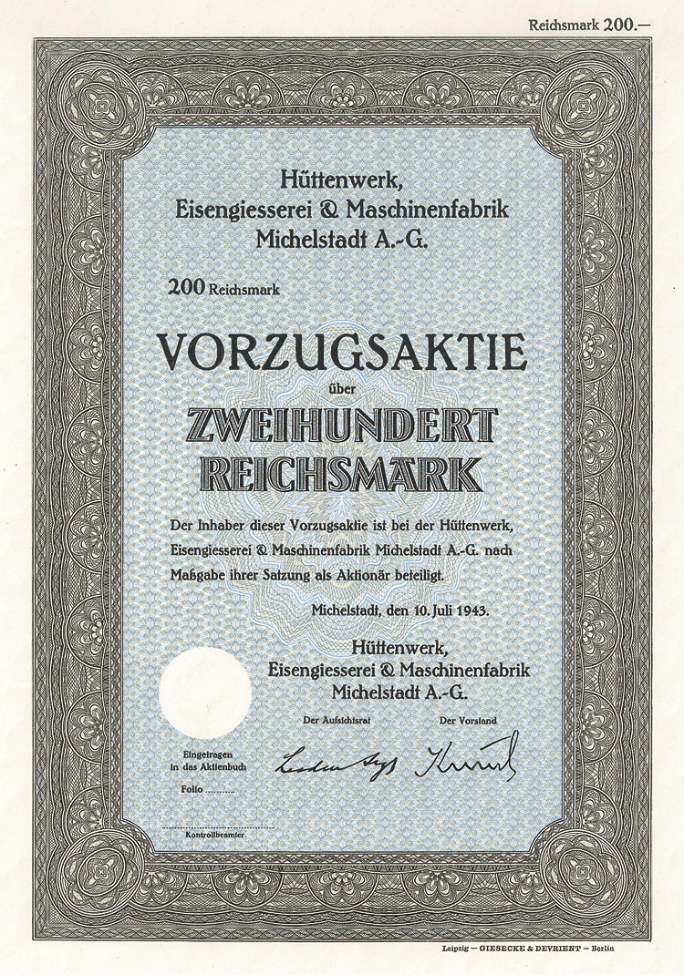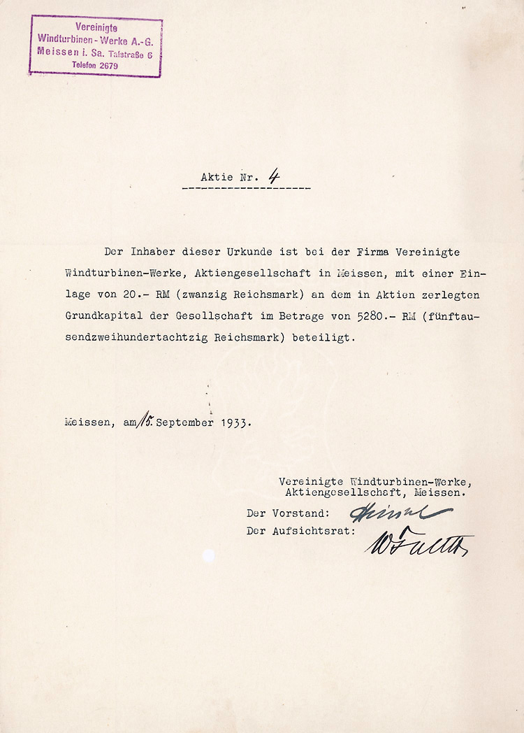 Auflage 750 (R 3). Gründung 1873 als Zittauer Maschinenfabrik und Eisengiesserei AG (früher Albert Kiesler & Co.) Dem Bedarf der Lausitzer Textilindustrie entsprechend war die Fa. auf den Bau von vollständigen Anlagen und einzelnen Maschinen für die Bleicherei, Mercerisation, Färberei und Druckerei von Textilien spezialisiert. Bis 1934 in Dresden, danach in Leipzig börsennotiert. Rückseitig als Namensaktie 1942 eingetragen. Lochentwertet.