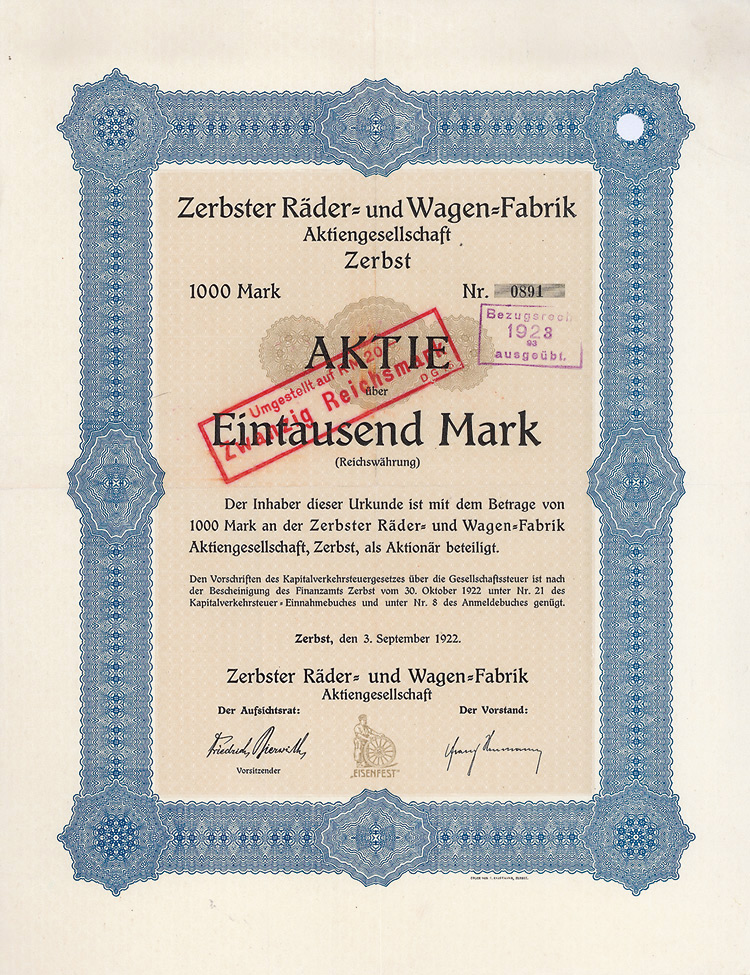 Gründeraktie, Auflage 2000 (R 7). Gründung 1922. Herstellung und Vertrieb von von Erzeugnissen der Räder- und Wagenindustrie. Über das Vermögen der Ges. wurde 1931 das Konkursverfahren eröffnet. Großformatiges Papier, unten Markenzeichen: Ein Schmid mit einem Speichenrad, darunter Schriftzug “Eisenfest”. Lochentwertet.