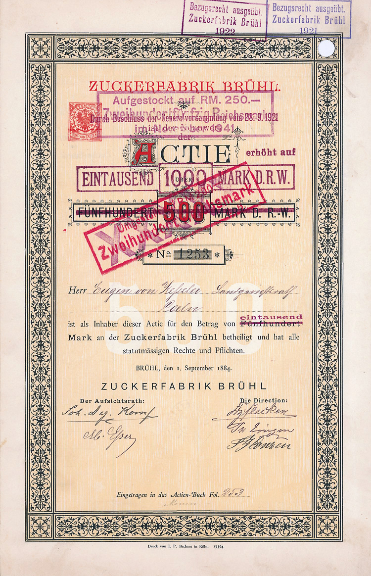 Auflage 931 (R 6). Gründung 1883 als Bauernzuckerfabrik. 1995 auf die Zuckerfabrik Jülich verschmolzen. Lochentwertet.