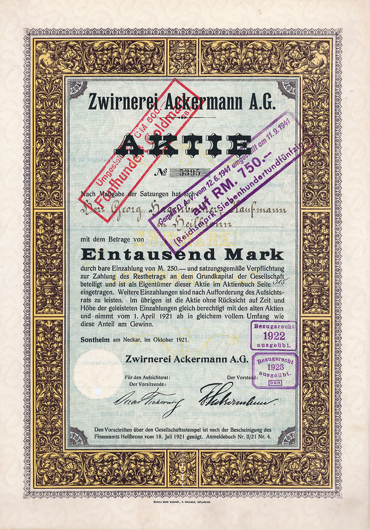 Auflage 2250 (R 6). Gegründet 1882 als “Mechanische Zwirnerei Heilbronn vorm. C. Ackermann & Cie.”, 1919 umbenannt wie oben. Betrieb einer Baumwollzwirnerei, außerdem Herstellung von Näh-, Häkel- und Stopfgarnen. 1957 Fusion mit der Zwirnerei & Nähfadenfabrik Göggingen zur Ackermann-Göggingen AG mit Sitz in Augsburg. 1994 nach Übernahme der Aktienmehrheit durch die Wisser-Dienstleistungsgruppe (die sich vor allem für den Immobilienbesitz interessierte) Verkauf des operativen Geschäfts an den Wettbewerber Amann & Söhne GmbH & Co. KG in Bönnigheim. Die AG selbst wurde in Anterra AG umbenannt und besteht noch heute als börsennotierte Vermögensverwaltungsgesellschaft. Sehr dekorative Zierumrandung im Historismusstil. Doppelblatt, inwendig Übertragungsvorgänge. Doppelblatt. Lochentwertet.
