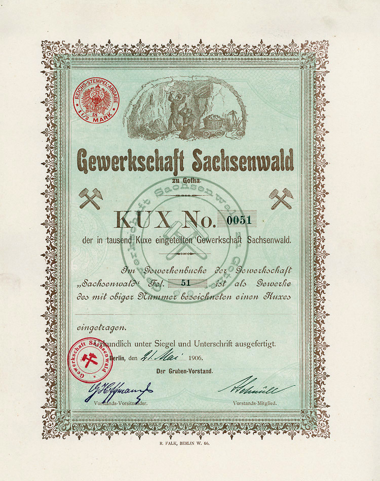 Auflage 1.000. Die Gothaische Gew. Sachsenwald ist 1906 aus einer früher gegründeten Bohrges. hervorgegangen. Sie besaß eine Konzession auf Kali und “beibrechende Salze” in der Gemarkung Westervesede (heute ein Ortsteil von Scheeßel) und wurde fündig. Zur Abteufung eines Schachtes kam es aber nicht. Bei Gründung dieser Gewerkschaft gab es bereits 50 in Betrieb befindliche Kalibergwerke, weitere 544 Unternehmen standen vor der Tür. Der Gesetzgeber reagierte mit dem Kaliwirtschaftgesetz von 1919, durch das die Überkapazitäten durch Stilllegung zahlreicher Werke weitgehend beseitigt wurden.