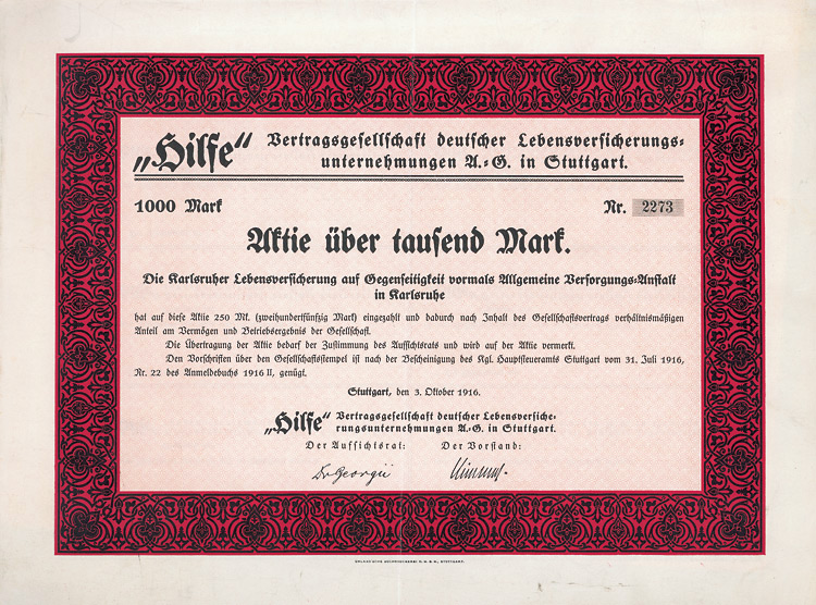 Erhaltung EF/VF Auflage 1000 (R 5). Sitz in Gotha, Verwaltungssitz in Berlin. Großformatiges Papier, recht dekorativ gestaltet. Lochentwertet.