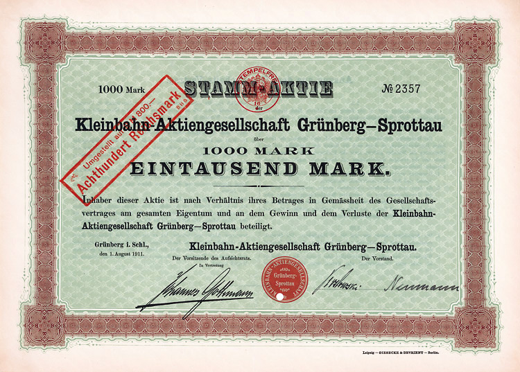 Erhaltung VF Auflage 400. Gründung am 12.7.1880. Fabrikation von weißem Zucker in Fraustadt und Raffinade in Glogau. 1910 Erwerb eines großen Rübengutes in Ober-Pritschen. Mit Dividenden bis zu 30 % eine der rentabelsten deutschen Zuckerfabriken. Börsennotiz Berlin und Breslau. Die Zuckerfabrik wird heute von der Cukrownia Wschowa S.A. betrieben. Lochentwertet.