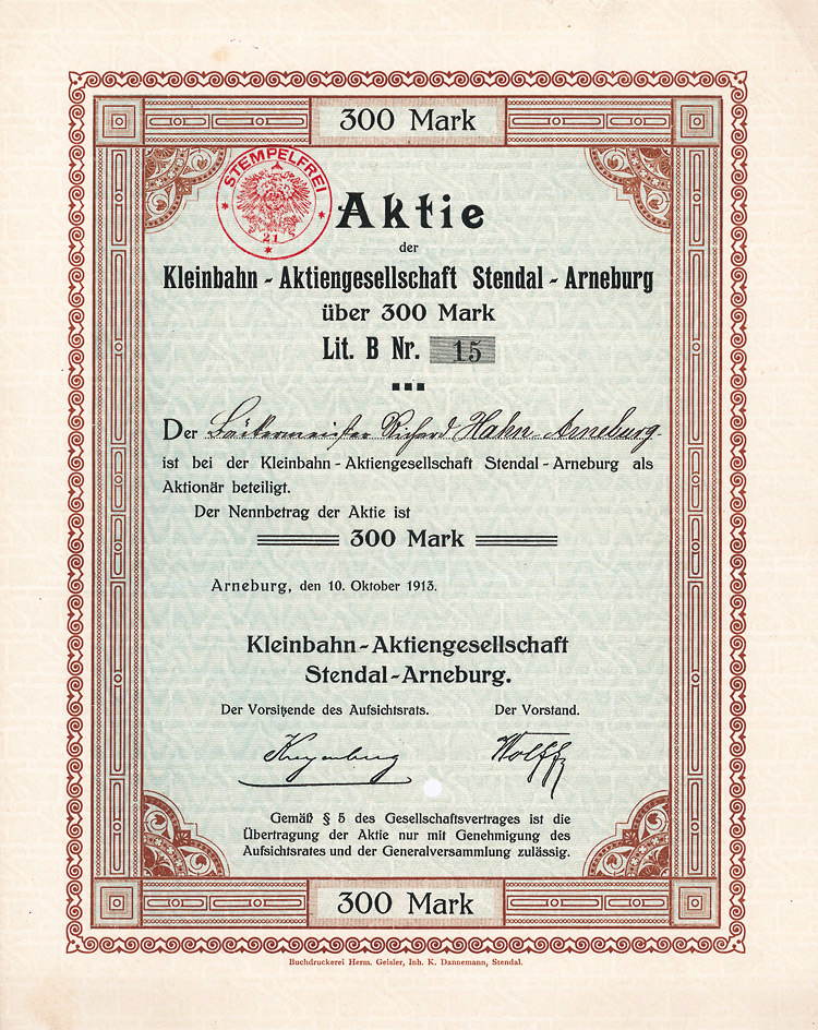 Namensaktie Littr. A 300 Mark, Nr. 1281