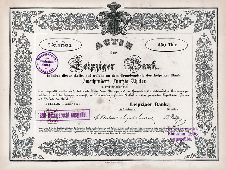 Erhaltung EF/VF Auflage 300 (R 5). Gründung 1889. Betrieb von Bankgeschäften aller Art, insbesondere die Vermittlung des Kapital- und Kreditverkehrs im Gewerbe, Handel, in der Industrie und Landwirtschaft. Gesellschaftskassen in Wurzen, Grimma, Mügeln und Oschatz, Sächsische Bank Filiale Leipzig, Zweigniederlassungen bestanden in Grimma, Mügeln und Oschatz. Lochentwertet.