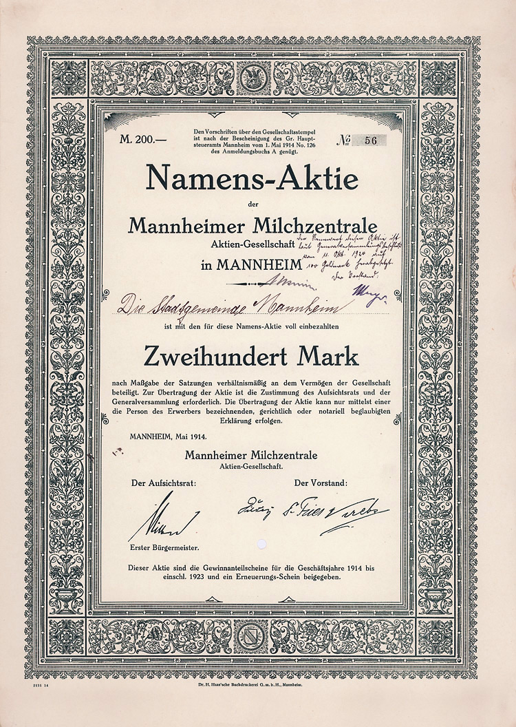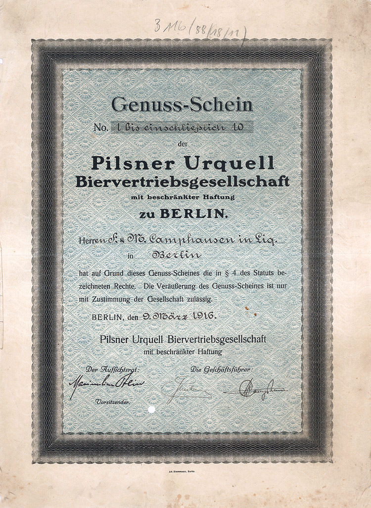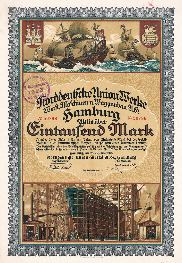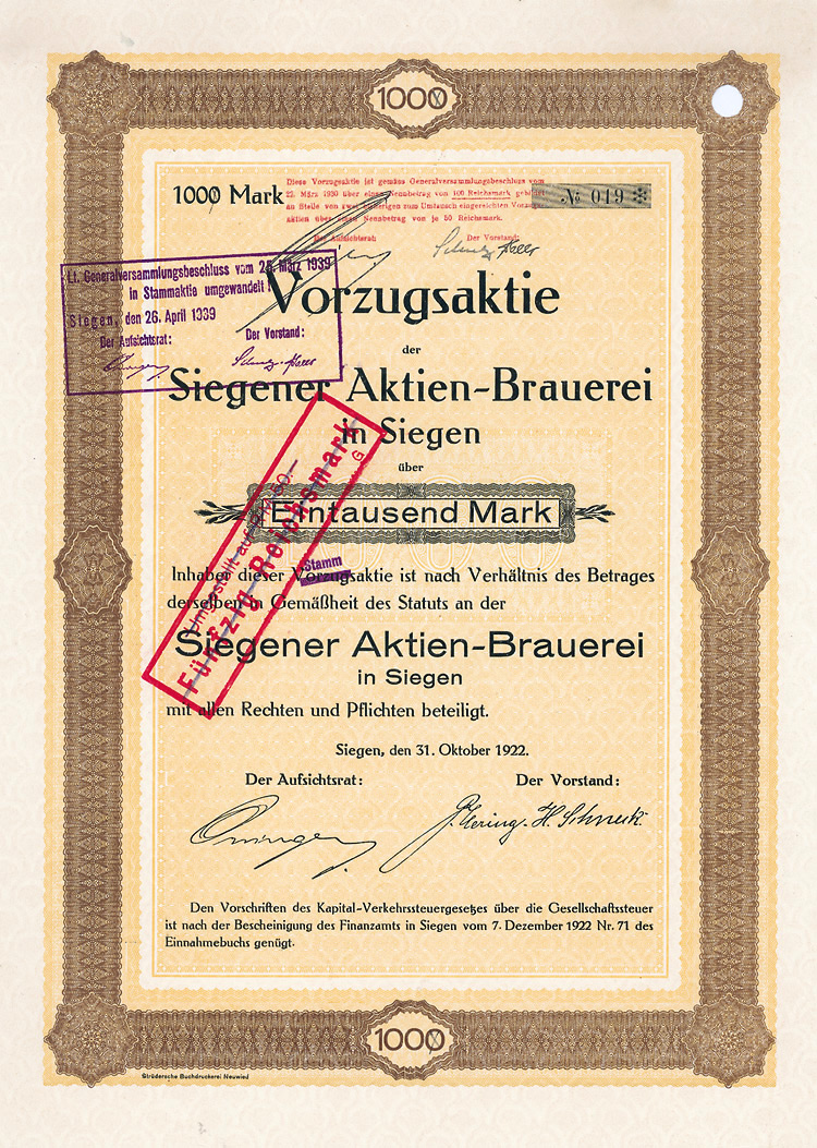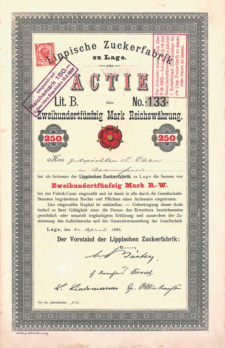 (R 5). Gründung 1882. Kurz danach noch Erwerb der Zuckerfabrik Prenzlau. Firmenmantel 1964 nach Hamburg verlagert. 1974 aufgelöst, 1994 erloschen. Lochentwertet. Rückseitig 1922 und 1934 übertragen worden.