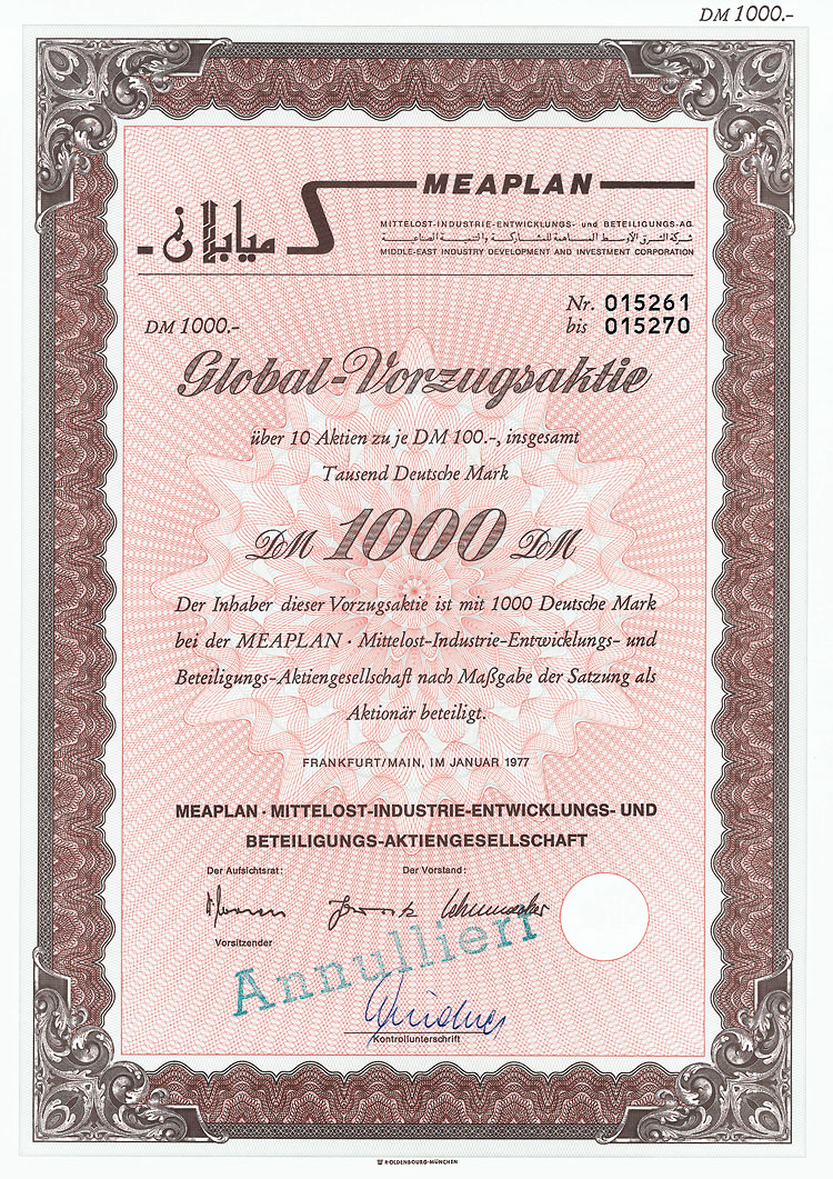 Auflage 1000 (R 4). Eine Beteiligung der MEHAG Merkantile Handels-AG. Lochentwertet. Doppelblatt.