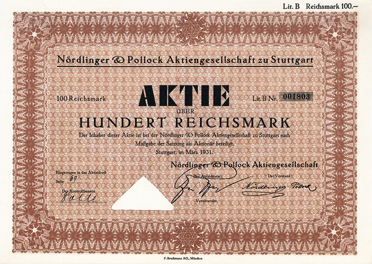 Auflage 3000, nach tlw. Umtausch in 1.000-RM-Aktien zuletzt noch 1650 (R 6). Schon 1872 wurde die Ziegelei Ganzenmüller & Baumgärtner gegründet, ab 1899 AG. Ende 1973 Stilllegung der Ziegelei und Überbauung des Geländes mit einem großen Gewerbepark. 1980 Umfirmierung in ZWL Grundbesitz und Beteiligungen AG. 2000 Verschmelzung der wichtigsten Beteiligung ElringKlinger GmbH auf die ZWL und Umfirmierung in ElringKlinger AG, zugleich Sitzverlegung von Ludwigsburg nach Dettingen/Ems. Heute als Hersteller von Dichtungen, Kunststofferzeugnissen und Baugruppen hauptsächlich für die Automobilindustrie einer der TOP-Werte im M-DAX. Lochentwertet.