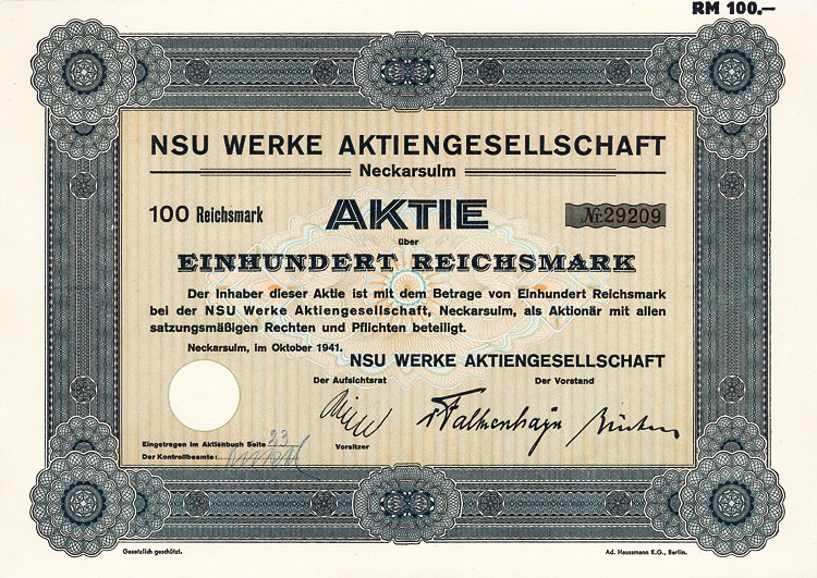 Aktie 100 RM, Nr. 1319