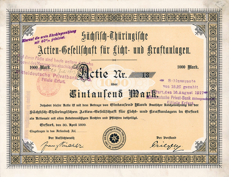 Aktie 1.000 Mark, Nr. 895