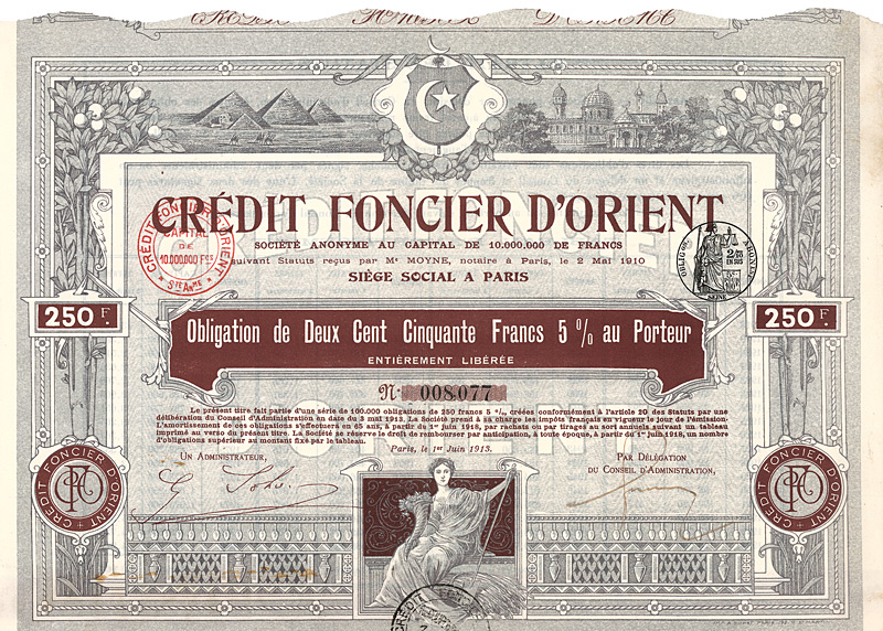 Tochtergesellschaft der mächtigen Imperial Ottoman Bank (Banque Impériale Ottomane, gegr. 1863), gegründet 1910 als Grundkreditinstitut in Ägypten, ging 1955 in der Banque de l’Union Commerciale auf. Hochdekorativ mit Pyramiden, orientalen Bauten, unten Fortuna. Maße: 23 x 31,8 cm. Mit anhängeden restlichen Kupons.