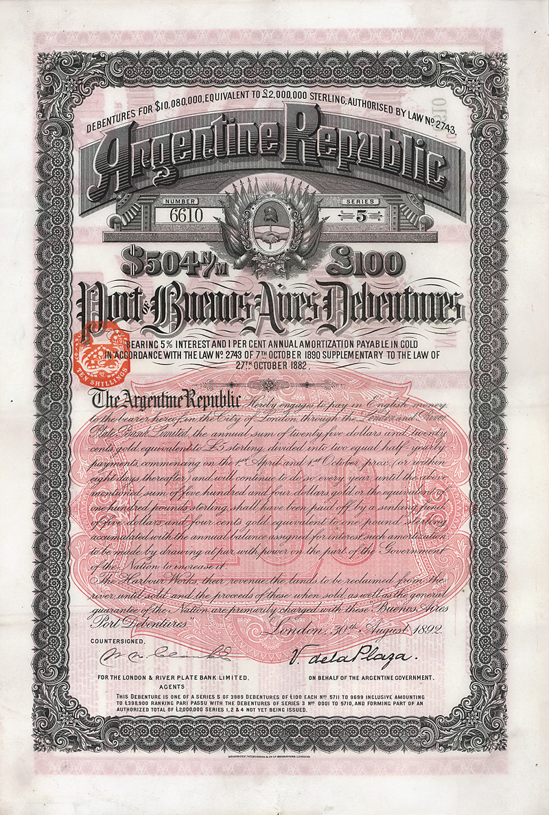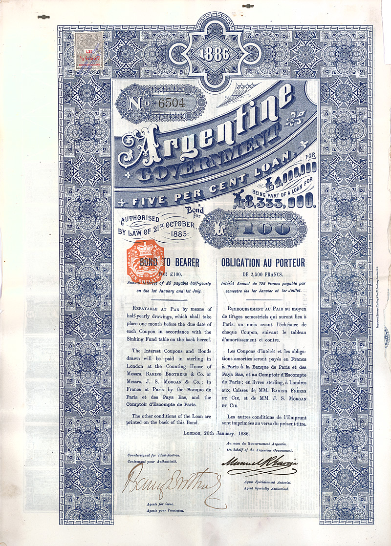 Auflage 16.000. Am 21.10.1885 von dem Kongress bewilligte äußere Anleihe im Volumen von 42 Mio. Gold-Piastren, abgesichert durch die Steuereinnahmen, platziert in London und Paris, Laufzeit bis 1922. Es war erst die zweite von der argentinischen Regierung aufgelegte externe Anleihe (die erste datiert 1884). Von den 1886 aufgelegten 8.333.000 £ waren im Dezember 1921 immer noch 8.114.900 £ ausstehend. Maße: 43,6 x 31,2 cm. Nicht entwertetes Papier mit anhängenden restlichen Kupons ab 1917. Das Stück stammt aus einem im 2. WK in Holland erbeutetem Archiv, welches erst jetzt im Safe eines ehemaligen ostdeutschen Ministeriums gefunden wurde. Das Archiv verwahrte neben versch. Schriftstücken auch einige wenige Wertpapiere, u.a. aus Großbritannien, Russland, China und Frankreich. Äußerst selten: nur 4 Stücke wurden gefunden!