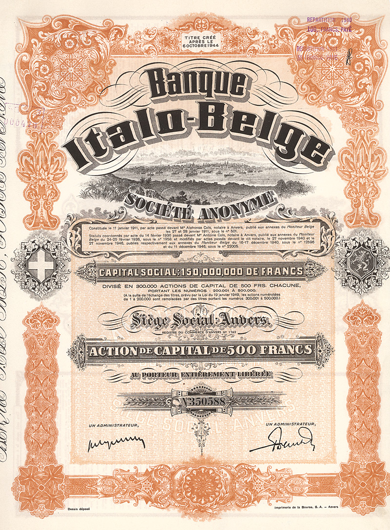 Das am 11.1.1911 gegr. Institut wurde 1974 zu Banque Européenne pour l‘Amérique Latine reorganisierest. Schöne Vign. mit Ansicht des Seehafens von Antwerpen. Maße: 37,2 x 27,5 cm. Erstmals von mir angeboten, Einzelstück beim Einlieferer!