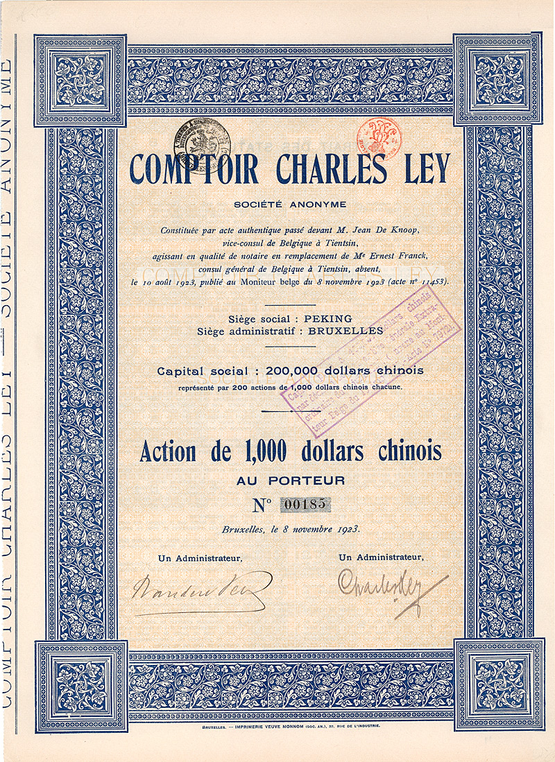 Gründeraktie, Auflage 200. Gegründet am 10.8.1923 mit Firmensitz in Peking, registriert im belgischen Generalkonsulat in Tientsin, verwaltet in Brüssel. Die Handelsgesellschaft führte Im- und Exportgeschäfte aller Art. Original signiert von dem Firmengründer Charles Ley. Maße: 37 x 26,9 cm. Mit anhängenden restlichen Kupons #3-28.