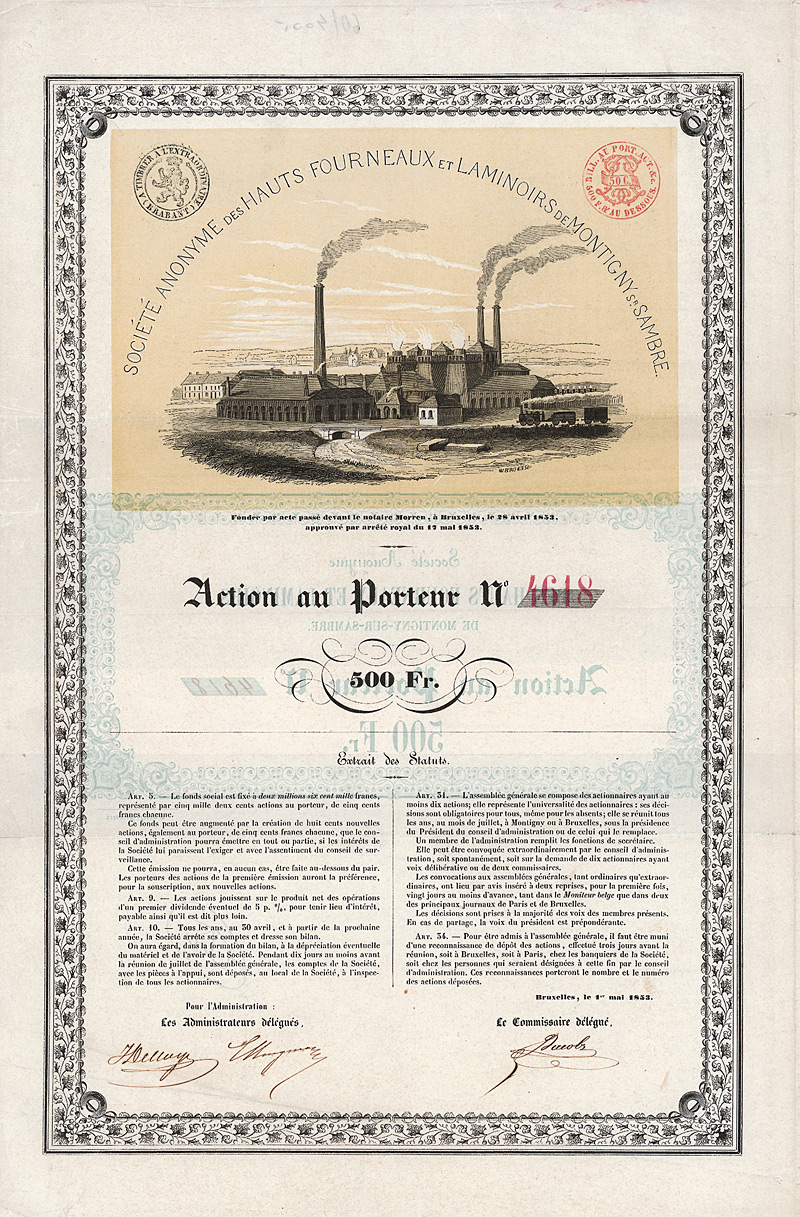 Gründeraktie, Auflage 5.200. Neben Großbritannien schritt die Industrialisierung in Belgien am schnellsten voran. Die reichen Kohlevorkommen in der Wallonie sowie der rasche Ausbau des Eisenbahnnetzes bildeten die Grundlage für eine bedeutende Eisen- und Stahlindustrie. Die Geschichte dieses Unternehmens geht auf das Jahr 1833 zurück, als Jean Pierre Champeaux-Chapel in Hainaut einen holzkohlebetriebenen Hochofen baute. Es folgte 1835 ein zweiter, nunmehr mit Koks betriebener Hochofen. Zu Beginn der 1840er Jahre gerieten nicht nur die Stahlpreise erheblich unter Druck, auch die Produzenten kämpften ums wirtschaftliche Überleben. Diese Situation nutzte Jean Pierre Champeaux-Chapel, indem er einen Zusammenschluss vieler Stahlproduzenten aus der Region erwirkte. 1853 gründete er mit Hilfe führender Banken und Industrieller in Montigny (heute Stadtteil von Charleroi) einen Großbetrieb mit einem modernen Walzwerk und Koksöfen. Die Fabrikanlage wurde von einer britischen Baugesellschaft errichtet. Durch günstige Rohstoffpreise und moderne, gestraffte Fertigung arbeitete das Unternehmen äußerst gewinnbringend. Äußerst dekorativer, großformatiger Druck. Das Stück gilt als das erste in Belgien als farbige Lithographie gedruckte Wertpapier und zeigt in einer großen Abbildung die Fabrikanlagen. Der Kupferstich stammt von dem schottischen Graveur William Brown. Mehrere Originalsignaturen. Maße: 43,2 x 27,8 cm. Mit anhängenden restlichen Kupons.