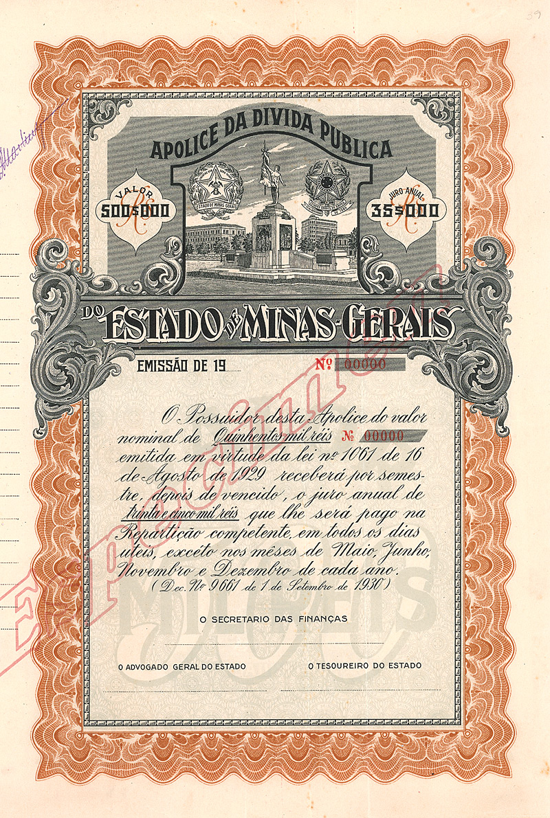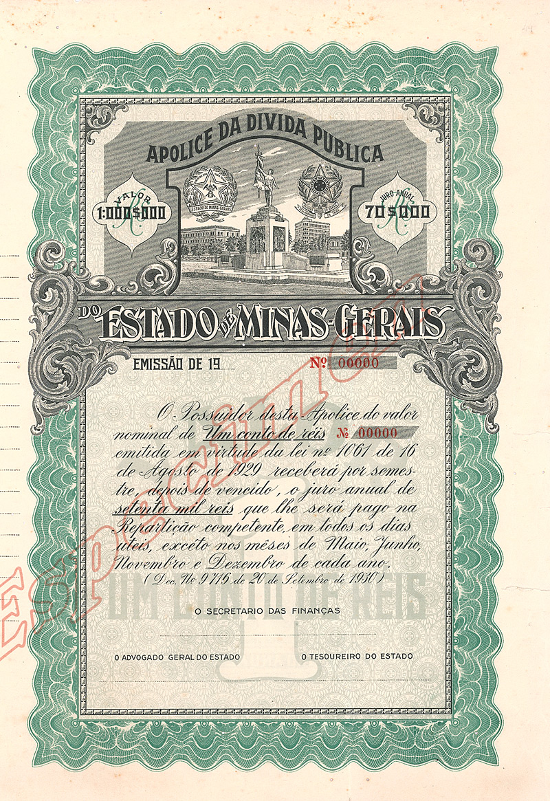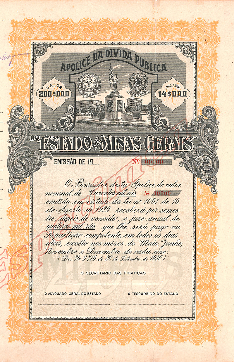 Nullgeziffertes Specimen! Der Bundesstaat Minas Gerais ist heute der wichtigste Bergbaustaat Brasiliens mit reichen Bodenschätzen. Abgebaut werden u.a. Eisen- und Manganerze, Graphit, sowie Gold (Ouro Preto) und Diamanten. Bis 1897 war Ouro Preto Hauptstadt. Apolice da divida publica (Schatzanweisung). Großformatiges Papier, dekorativ gestaltet, Vignette mit Denkmal, dahinter Regierungssitz, Provinzial- und Staatswappen. Maße: 37 x 35 cm. Etwas wurmstichig. Rarität aus einer uralten Sammlung.