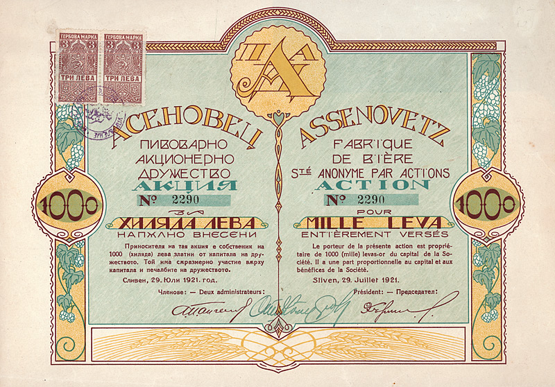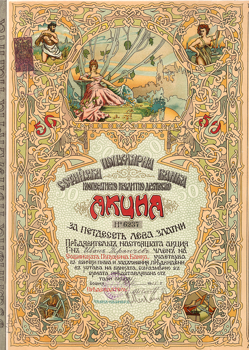 Die bulgarischen Volksbanken wurden nach dem Muster von Kreditgenossenschaften errichtet. Das Stammkapital wurde durch Zeichnung von Anteilen der Mitglieder aufgebracht. Kredite wurden nur an diese vergeben. Der Generalverband der Volksbanken war das Kontrollorgan und übte durch die Bulgarische Landwirtschafts- und Genossenschaftsbank Aufsicht und Kontrolle aus. Großformatig. Die Aktie gehört zu den schönsten und kunstvollsten Wertpapieren überhaupt, sie ist zum Teil im Golddruck ausgeführt und hat sowohl türkisch-osmanische als auch Jugendstil-Elemente. Links unten Künstlersignatur in der Druckplatte (Lazarow). Maße: 42 x 30,5 cm. Mit anhängenden restlichen Kupons ab 1938.