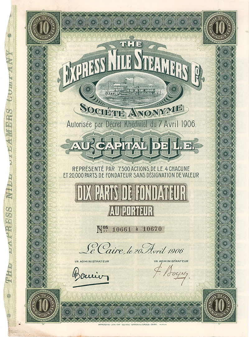 Gründungsemission, Auflage 1.000. Die Gründung der Nil-Express-Dampfschifffahrts-Gesellschaft wurde am 7.4.1906 vom ‘Abbas II. Hilmi, dem Khediven von Ägypten, genehmigt. Der Kreis der Gründer war international besetzt: Otto Sterzing aus Deutschland, Georges Pangalo aus Griechenland, Oscar Emsheimer aus USA, Henri H. de Vries aus Holland, Henri Boutigny aus Grossbritannien, Gustave Lantié aus Frankreich und Paul Vereecken aus Belgien. Herrliche Vignette mit Abbildung eines typischen Touristen-Nildampfers. Die mehrstöckigen Dampfer waren speziell für den Einsatz in den stellenweise sehr flachen Nilgewässern konstruiert. Maße: 35,5 x 25,2 cm. Mit komplett anhängendem Kuponbogen.