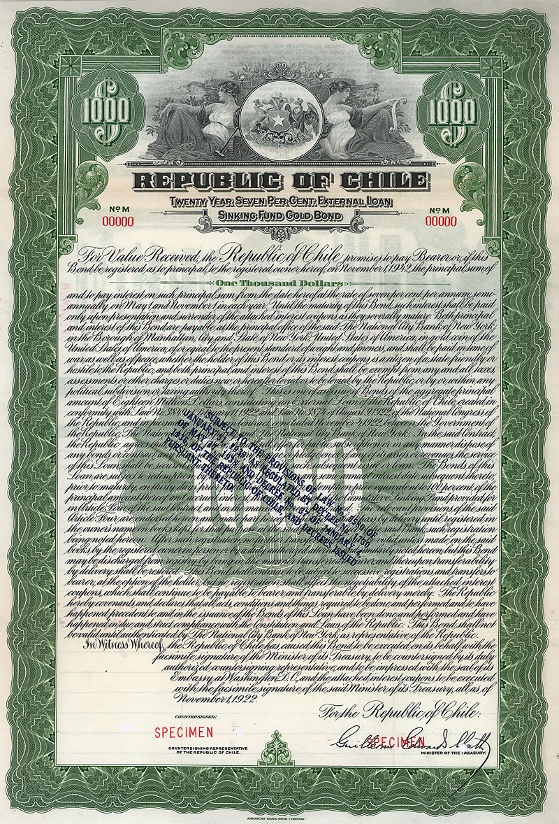 Auflage 3.989. Emissionsvolumen 10.080.000 US$ Gold = 2 Mio. £ Sterling, platziert in London und in New York, Laufzeit bis 1937, abgesichert durch die Zentralregierung. Maße: 43,5 x 29 cm. Nicht entwertetes Papier mit anhängenden restlichen Kupons ab 1917. Da die Anleihe Mitte der 30er Jahre getilgt wurde, kann man davon ausgehen, dass das hier angebotene Stück einfach vergessen worden ist! Nur 3 Exemplare wurden in einem Archiv gefunden. Bisher nur als Specimen bekannt!