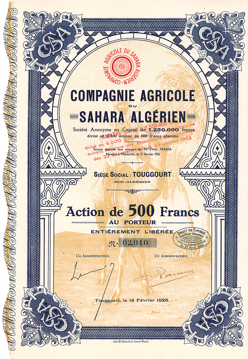 Gründeraktie, Auflage 2.500. Französische Kolonialgesellschaft, gegründet 1926, besaß Grundbesitz und betrieb Landwirtschaft in der Provinz Ouargla im südöstlichen Algerien. Sehr dekorativ mit exotischen Verzierungen und großer Unterdruckabbildung eines auf Kamel reitenden Berbers. Maße: 30,6 x 20,5 cm. Mit anhängenden restlichen Kupons.