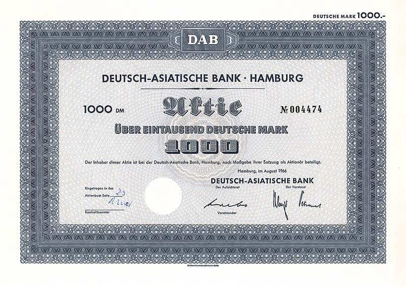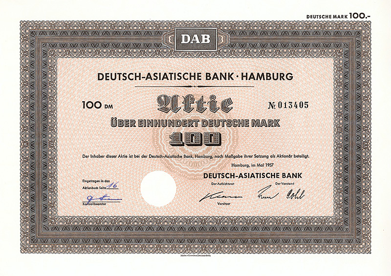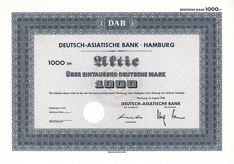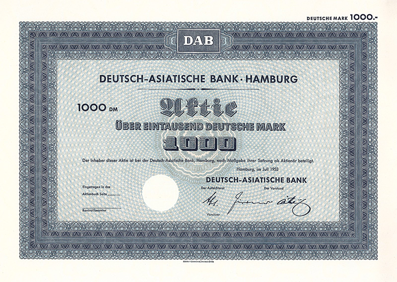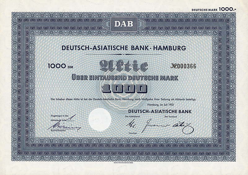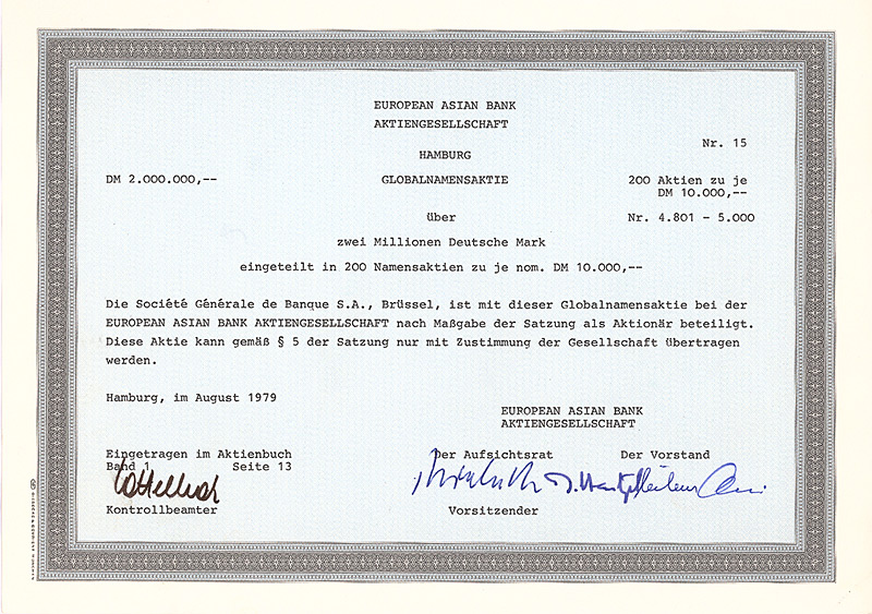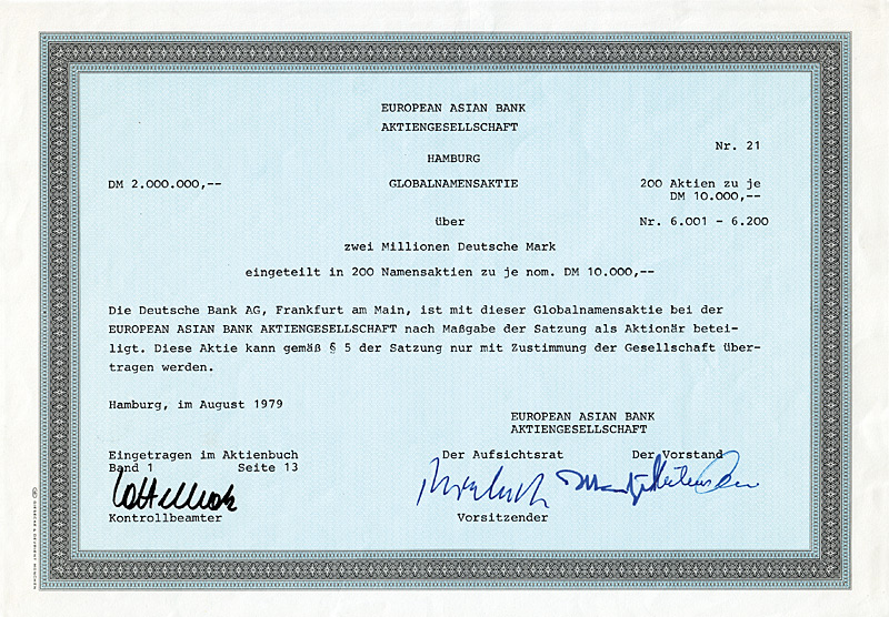 In die 1972 gegründete Europäisch-Asiatische Bank AG ging die 1889 gegründete Deutsch-Asiatische Bank. Gründer waren Deutsche Bak AG, Frankfurt a.M., Amsterdam-Rotterdam Bank NV, Amsterdam, Creditanstalt-Bankverein, Wien, Midland Bank Ltd., London, Soc. Gle. S.A., Paris, Soc. Gle. de Banque S.A., Brüssel. 1977 wurde diese Neugründung in “European Asian Bank” umbenannt. Nachdem die meisten Partnerbanken sich aus der European Asian Bank zurückgezogen hatten, wurde diese 1986 in “Deutsche Bank (Asia)” umbenannt, bevor sie 1987/88 zusammen mit ihren 14 Branchen mit der Deutschen Bank verschmolzen wurde. 1979 hielten 7 Aktionäre das Kapital der Ges. zu 100%: Amsterdam-Rotterdam Bank NV, Banca Commerciale Italiana, Mailand, Creditanstalt-Bankverein, Wien, Deutsche Bank AG, Frankfurt a.M., Midland Bank Ltd., London, Soc. Gle. S.A., Paris, Soc. Gle. de Banque S.A., Brüssel. Maße: 21 x 29,7 cm. 7 Stücke (#15-21) wurden von dem Reißwolf gerettet, jeweils ausgestellt auf einen der 7 Aktionäre. Die hier angebotene Globalaktie über 2 Mio. DM wurde ausgestellt auf die Soc. Gle. de Banque S.A., Brüssel. Originalsignaturen. Keine Entwertung. Finanzhistorisch hochinteressante Rarität.