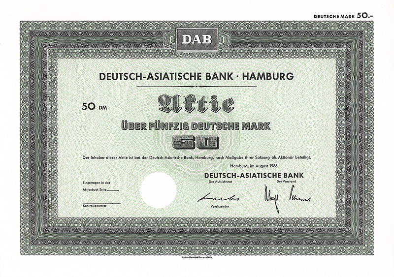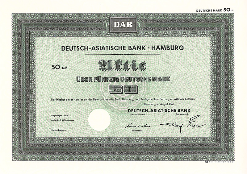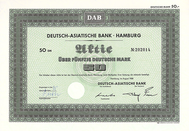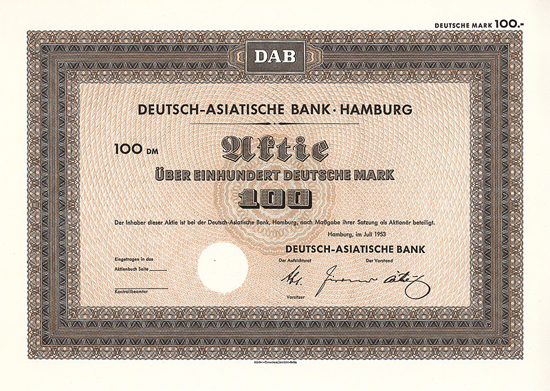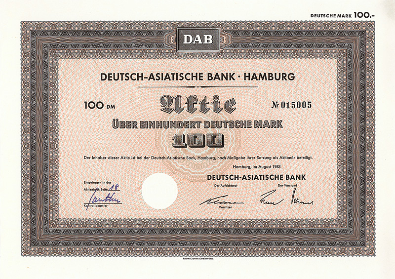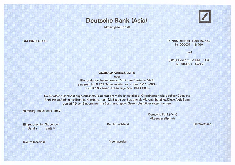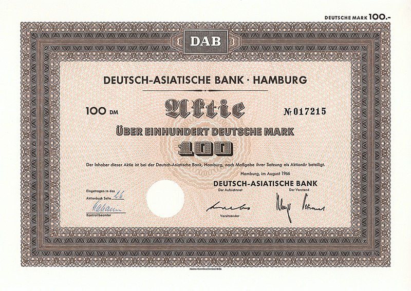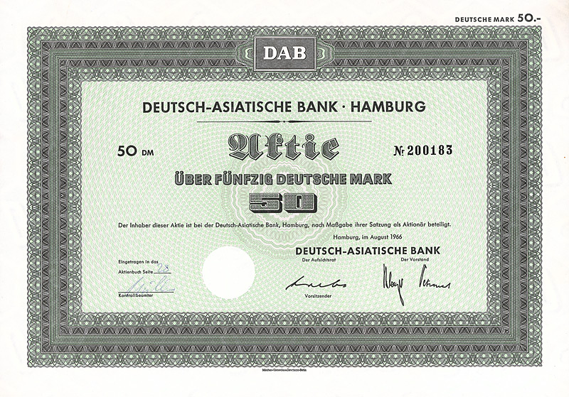 In die 1972 gegründete Europäisch-Asiatische Bank AG ging die 1889 gegründete Deutsch-Asiatische Bank. Gründer waren Deutsche Bak AG, Frankfurt a.M., Amsterdam-Rotterdam Bank NV, Amsterdam, Creditanstalt-Bankverein, Wien, Midland Bank Ltd., London, Soc. Gle. S.A., Paris, Soc. Gle. de Banque S.A., Brüssel. 1977 wurde diese Neugründung in “European Asian Bank” umbenannt. Nachdem die meisten Partnerbanken sich aus der European Asian Bank zurückgezogen hatten, wurde diese 1986 in “Deutsche Bank (Asia)” umbenannt, bevor sie 1987/88 zusammen mit ihren 14 Branchen mit der Deutschen Bank verschmolzen wurde. 1979 hielten 7 Aktionäre das Kapital der Ges. zu 100%: Amsterdam-Rotterdam Bank NV, Banca Commerciale Italiana, Mailand, Creditanstalt-Bankverein, Wien, Deutsche Bank AG, Frankfurt a.M., Midland Bank Ltd., London, Soc. Gle. S.A., Paris, Soc. Gle. de Banque S.A., Brüssel. Maße: 21 x 29,7 cm. 7 Stücke (#15-21) wurden von dem Reißwolf gerettet, jeweils ausgestellt auf einen der 7 Aktionäre. Die hier angebotene Globalaktie über 2 Mio. DM wurde ausgestellt auf die Soc. Gle. de Banque S.A., Brüssel. Originalsignaturen. Keine Entwertung. Finanzhistorisch hochinteressante Rarität.