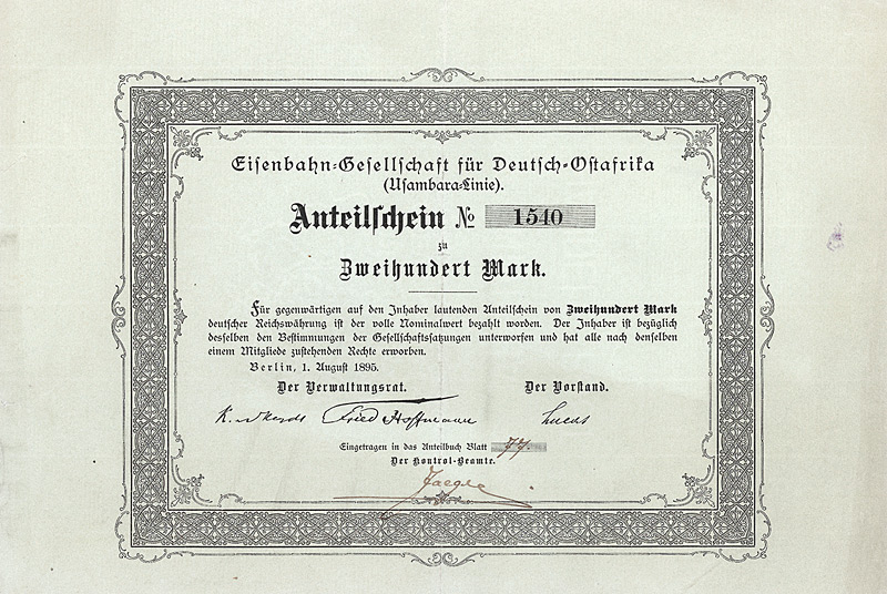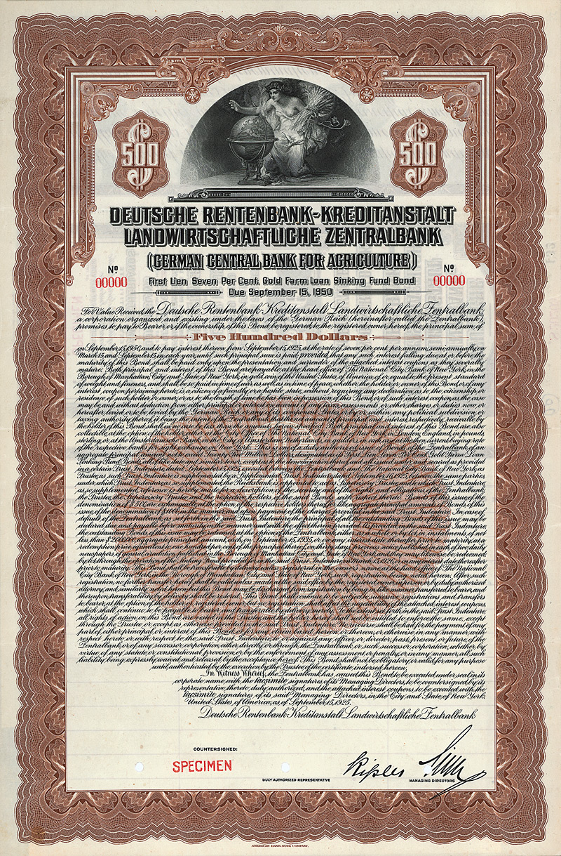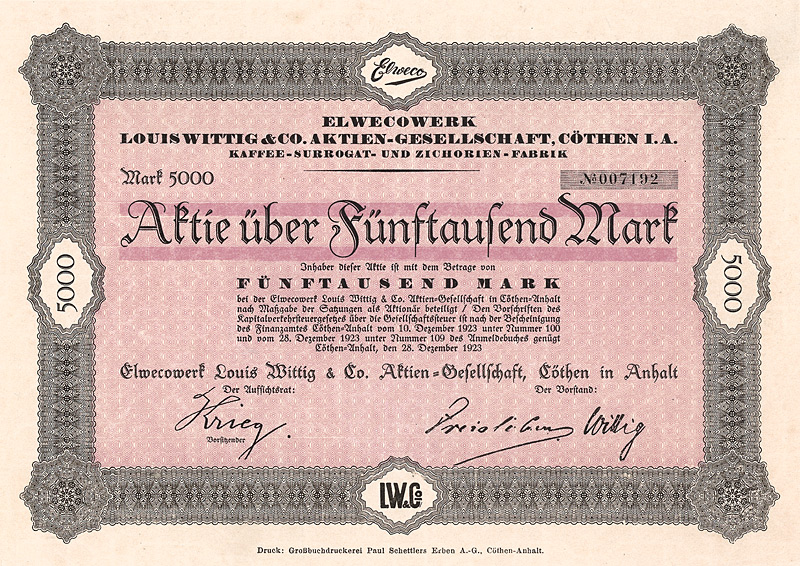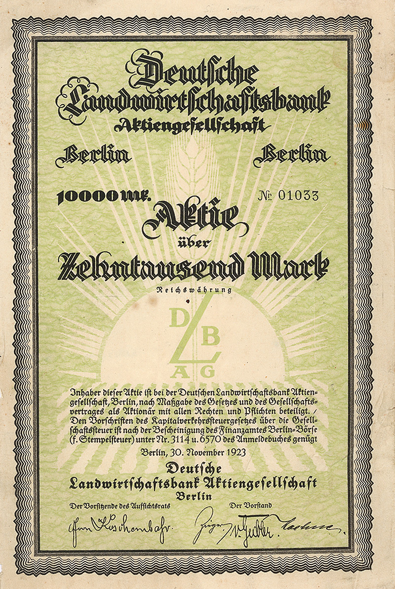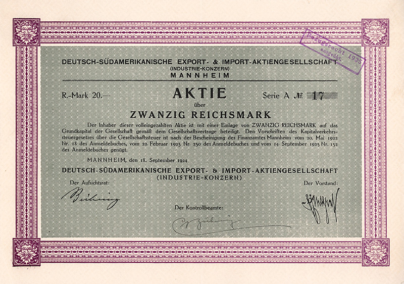 Auflage 250 (R 10). Gründung Mitte 1922 durch Ludwigshafener und Mannheimer Geschäftsleute zwecks Ein- und Ausfuhrhandel mit Südamerika. Niederlassungen bestanden in Buenos-Aires und in Rio de Janeiro. Bei der Kapitalumstellung im Herbst 1924 von 62 Mio. Papiermark auf nur noch 5.000 Goldmark wurden 61.750 Aktien eingezogen, nur 250 Aktien wurden auf je 20 GM umgestellt. 1927 von Amts wegen gelöscht. Vier Eck-Vign. mit Abb. eines Faungesichtes. Maße: 21,1 x 29,8 cm. Mit kpl. Kuponbogen.