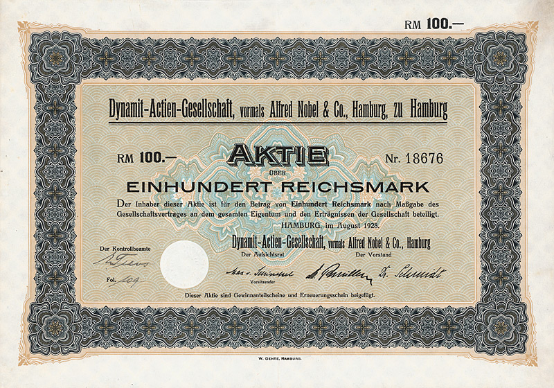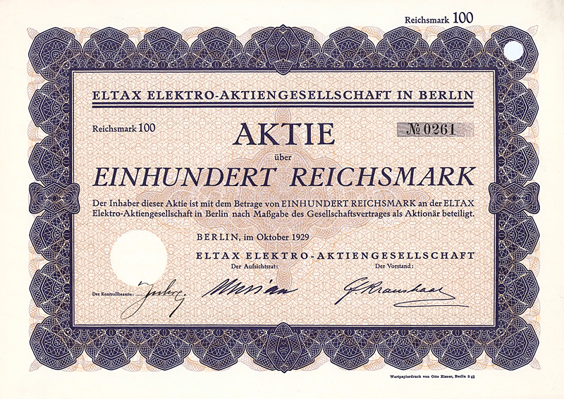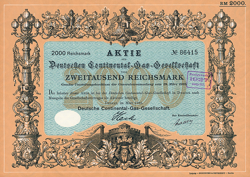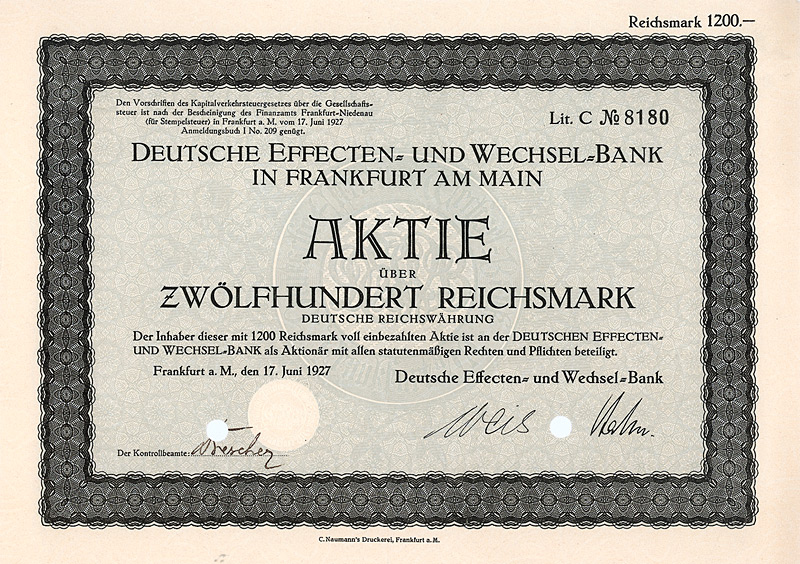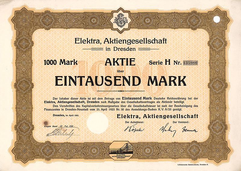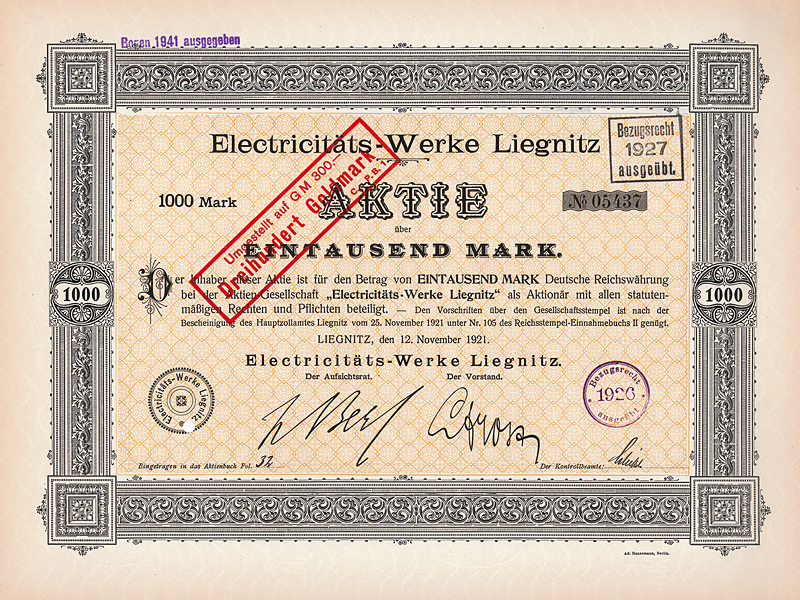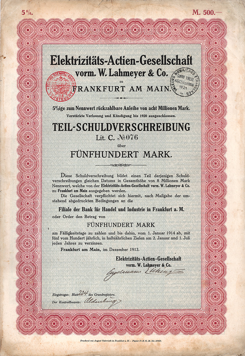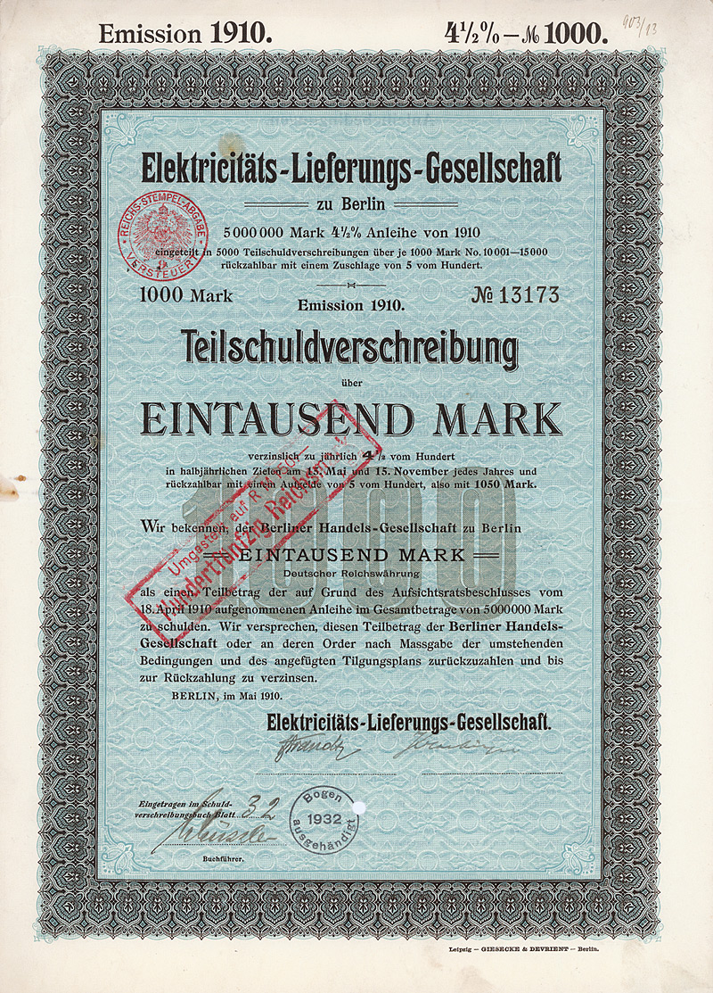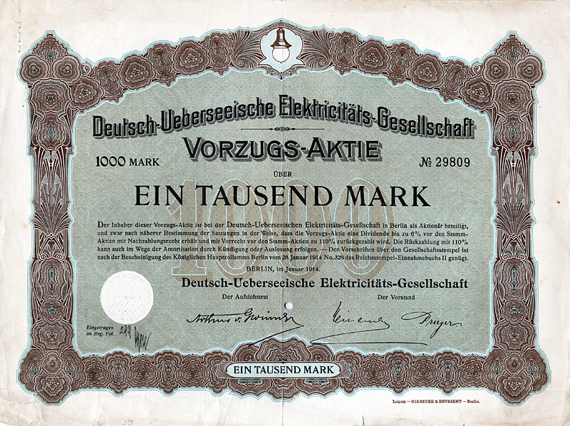 Auflage 30.000 (R 11). Gründung 1898 unter Führung der AEG zur Errichtung von Elektrizitätswerken vor allem in Südamerika (Buenos Aires, Santiago de Chile, Valparaiso, Montevideo). Die mit Abstand wichtigste Aktivität wurde später die Stromversorgung der argentinischen Hauptstadt Buenos Aires, die damals schon 2,5 Mio. Einwohner hatte, aufgrund einer 1907/08 erteilten 50-jährigen Konzession. Dafür hatte die DÜEG in der Stadt über 5.000 km Stromkabel verlegt. Ferner besaß die DÜEG eine Mehrheitsbeteiligung an der “Chilian Electric Tramway and Light Co.” (betrieb die 128 km lange elektrische Straßenbahn in Santiago), ein Wasserkraftwerk am Rio Maipo, ca. 18 km von Santiago entfernt, das gesamte Kapital der “Elektrische Straßenbahn Valparaiso AG” (43 km Betriebsklänge) sowie die Aktienmehrheit der “La Transatlántica Cia. de Tranvias Eléctricos” in Montevideo (betrieb die 134 km lange elektrische Straßenbahn in Montevideo nebst Elektrizitätswerk). Die Aktien der DÜEG notierten an den Börsen Berlin, Frankfurt a.M. und Brüssel und waren auch zum Terminhandel zugelassen. Die Liste der Aufsichtsräte liest sich bis zuletzt wie das “Who ist who” der deutschen Hochfinanz: Arthur von Gwinner, Arthur Salomonsohn, Hugo Landau, Felix Deutsch, Dr. Walther Rathenau, M. v. Klitzing, Bankier Dr. Carl Sulzbach u.v.m. Der Ausgang des 1. Weltkrieges raubte der DÜEG die Salonfähigkeit im Ausland und machte sie geschäftlich handlungsunfähig. 1920 gingen deshalb alle Aktiva auf eine AG spanischen Rechts über, die “Cia. Hispano-Americana de Electricidad S.A.”. Ein Schelm, wer denkt, daß sich dabei an den Eigentümerstrukturen etwas geändert hätte. Die DÜEG selbst wurde bei diesem Wechsel des Kleides so weit ausgezogen, daß ihr Vermögen bei der Goldmarkumstellung unter 5.000 Goldmark fiel und sie deshalb 1925 vom Amts wegen gelöscht wurde. Schöne Sütterlin-Umrahmung mit Glühlampe. Mit Faksimileunterschrift Arthur von Gwinner (Vorstand Deutsche Bank) als AR-Vorsitzender. Lochentwertet. Maße: 26,1 x 35 cm. Randeinrisse im unteren Bereich, Ecken und die Rückseite etwas fleckig. Rarität: nur zwei Stücke sind bis heute erhalten geblieben!