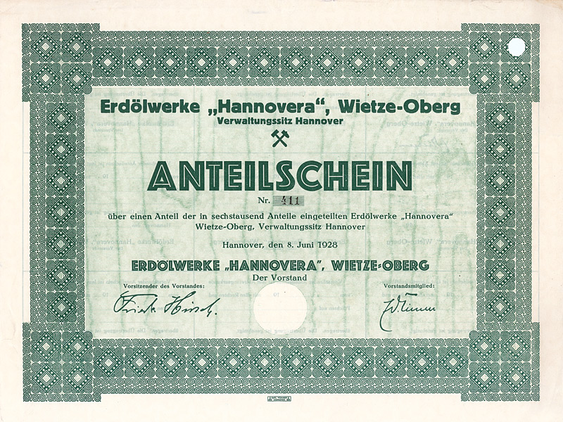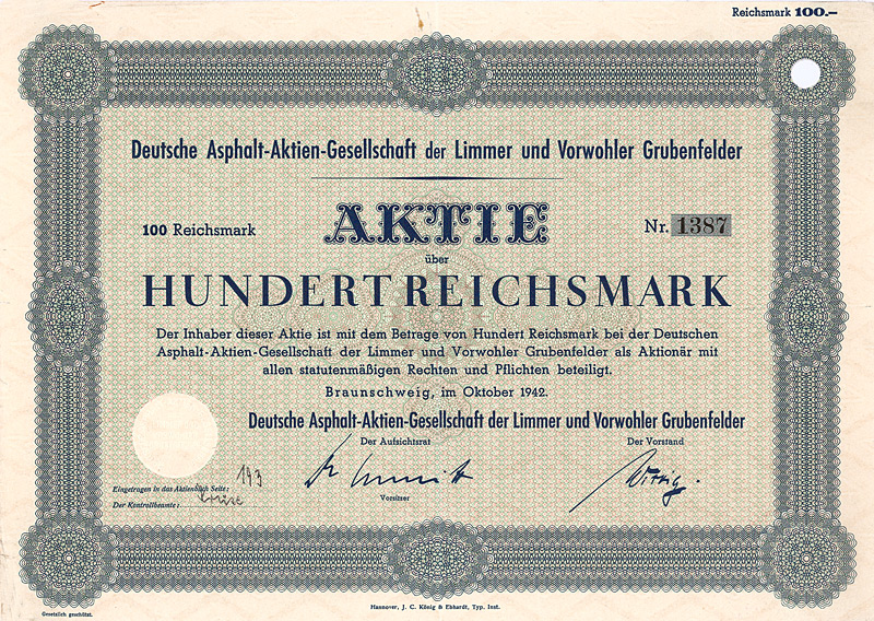 Auflage 1.200 (R 10). Gründung 1873, seither kontinuierlicher Aufkauf von Konkurrenz-Firmen. Asphalt-Gruben bei Eschershausen und Hannover. Gehört über die Braunschweig GmbH zur heutigen NORD/LB (vorm. Braunschweigische Staatsbank). Lochentwertet. Maße: 21 x 29,8 cm. Nur 5 Stücke sind bis heute erhalten geblieben!