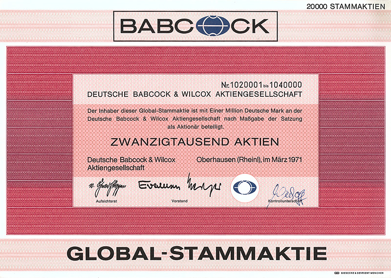 (R 8) Die Mutterfirma wurde bereits 1881 von den Amerikanern George H. Babcock und Stephen Wilcox gegründet. Sie erfanden 1867 den patentierten Hochdruck-Dampfkessel. Die Deutsche Babcock & Wilcox-Dampfkessel-Werke AG wurde im Oktober 1898 durch Übernahme des Berliner Zweigwerks der Babcock & Wilcox Ltd., London gegründet. Die Gesellschaft erhielt das Fabrikations- und Verkaufsrecht für das Deutsche Reich und dessen Kolonien. Wenig später wurde in Oberhausen ein großes neues Werk errichtet. Der bedeutendste europäische Hersteller auf dem Gebiet des konventionellen Dampferzeugerbaus erweiterte ab 1966 das Angebot auf 10 Produktlinien des Maschinen- und Industrieanlagenbaus einschließlich vieler Firmen-Übernahmen. Umfimiert 1976 in Deutsche Babcock AG, 2000 in Babcock Borsig AG. Zuletzt Holding für über 200 Tochtergesellschaften, darunter die weltbekannte U-Boot-Werft HDW. Nach deren umstrittenem Verkauf kam Mitte 2002 die spektakuläre Insolvenz. Maße: 21 x 29,8 cm. Mit restlichen Kupons. Prägesiegel lochentwertet.