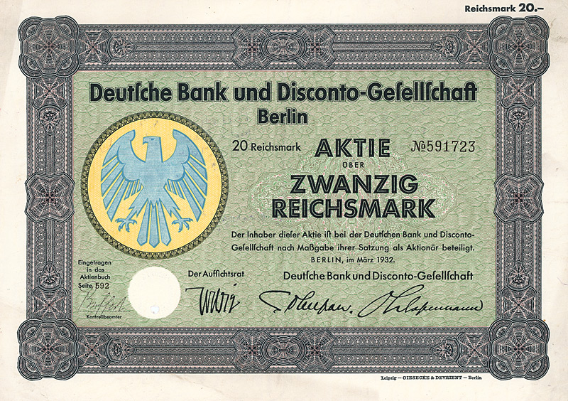 Maße: 21 x 29,7 cm. Die hier angebotene Globalaktie über 2 Mio. DM wurde ausgestellt auf die Deutsche Bank AG, Frankfurt am Main. Originalsignaturen. Keine Entwertung. Finanzhistorisch hochinteressante Rarität.