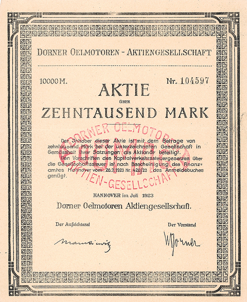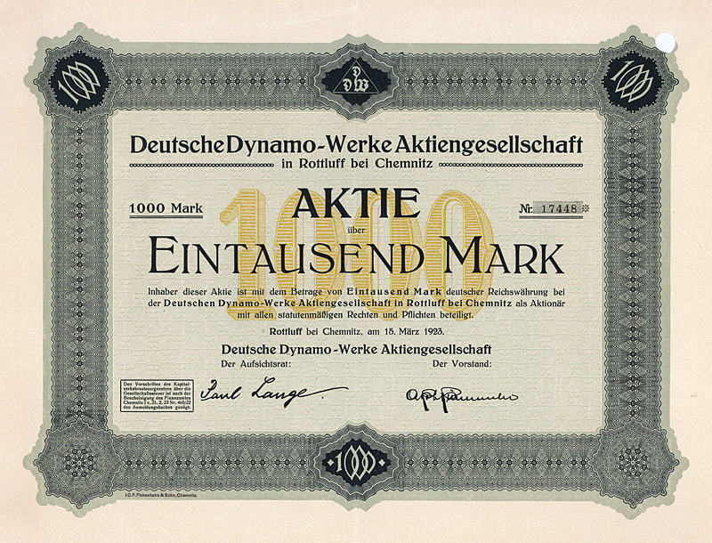 Auflage 20.000. Gründung 1918. Betrieb einer Maschinenfabrik, speziell Herstellung von Sägewerks- und Holzbearbeitungs-Maschinen, Transmissionen, Werkzeugen. 1931 Übernahme der Selp-Werke vorm. Stoll & Elschner AG Leipzig durch Fusion, was der Firma auf dem Höhepunkt der Weltwirtschaftskrise nicht so gut bekam: Ende 1931 Zahlungseinstellung und Zwangsvergleich. Lochentwertet. Maße: 18,6 x 28,1 cm.