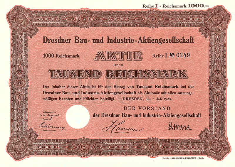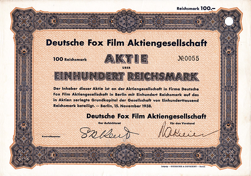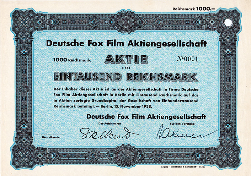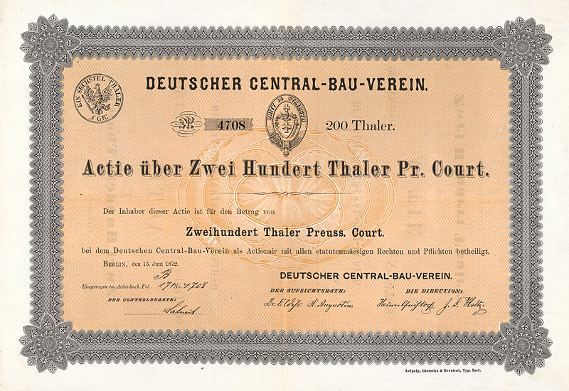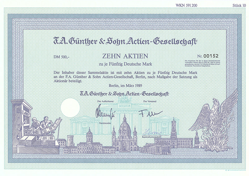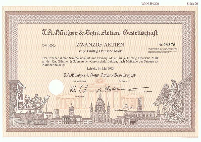 Auflage 200 (R 6). Gründung 1908/09 durch Zusammenführung der Firmen F. A. Günther & Sohn, Elektrotechnischer Anzeiger sowie F. A. Günthers Zeitungsverlag GmbH. In diesem Verlag erschienen 9 Zeitschriften, darunter der “Elektrotechnische Anzeiger”, die “Bäcker- und Konditor-Zeitung”, “Der Damenputz”, “Die Lederwelt” und die “Deutsche Sportartikel-Zeitung”. Die in Berlin börsennotierten Aktien fristeten lange Zeit ein Mauerblümchendasein als inhaltsloser Mantel, nachdem 1965/71 der gesamte technische Betrieb und die Beteiligung an der F. A. Günther & Sohn Buchdruckerei und Verlag GmbH verkauft worden waren. In rascher Folge wurde der Sitz nach Hamburg (1979), Krefeld (1982), Aachen (1983) und Düsseldorf (1985) verlegt. Mit der Sitzverlegung nach Leipzig (1991) wurde die AG reaktiviert und in den neuen Bundesländern zu einer wichtigen Größe im Immobiliengeschäft entwickelt. Nach guten Jahren mit bis zu 20 DM Dividende folgte der Absturz: 1997 Eröffnung des Gesamtvollstreckungsverfahrens. Wegen der immensen Verlustvorträge seither immer wieder einmal ein Spielball der Mantelspekulation. Maße: 21 x 29,6 cm. Mit restlichen Kupons.