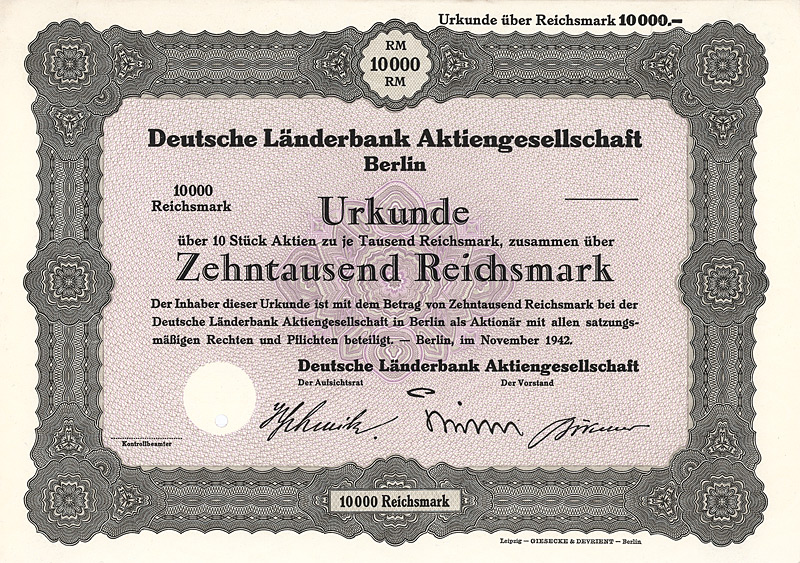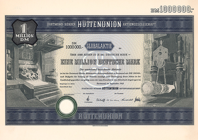 Maße: 21 x 29,7 cm. Die hier angebotene Globalaktie über 2 Mio. DM wurde ausgestellt auf die Société Générale S.A., Paris. Originalsignaturen. Keine Entwertung. Finanzhistorisch hochinteressante Rarität.